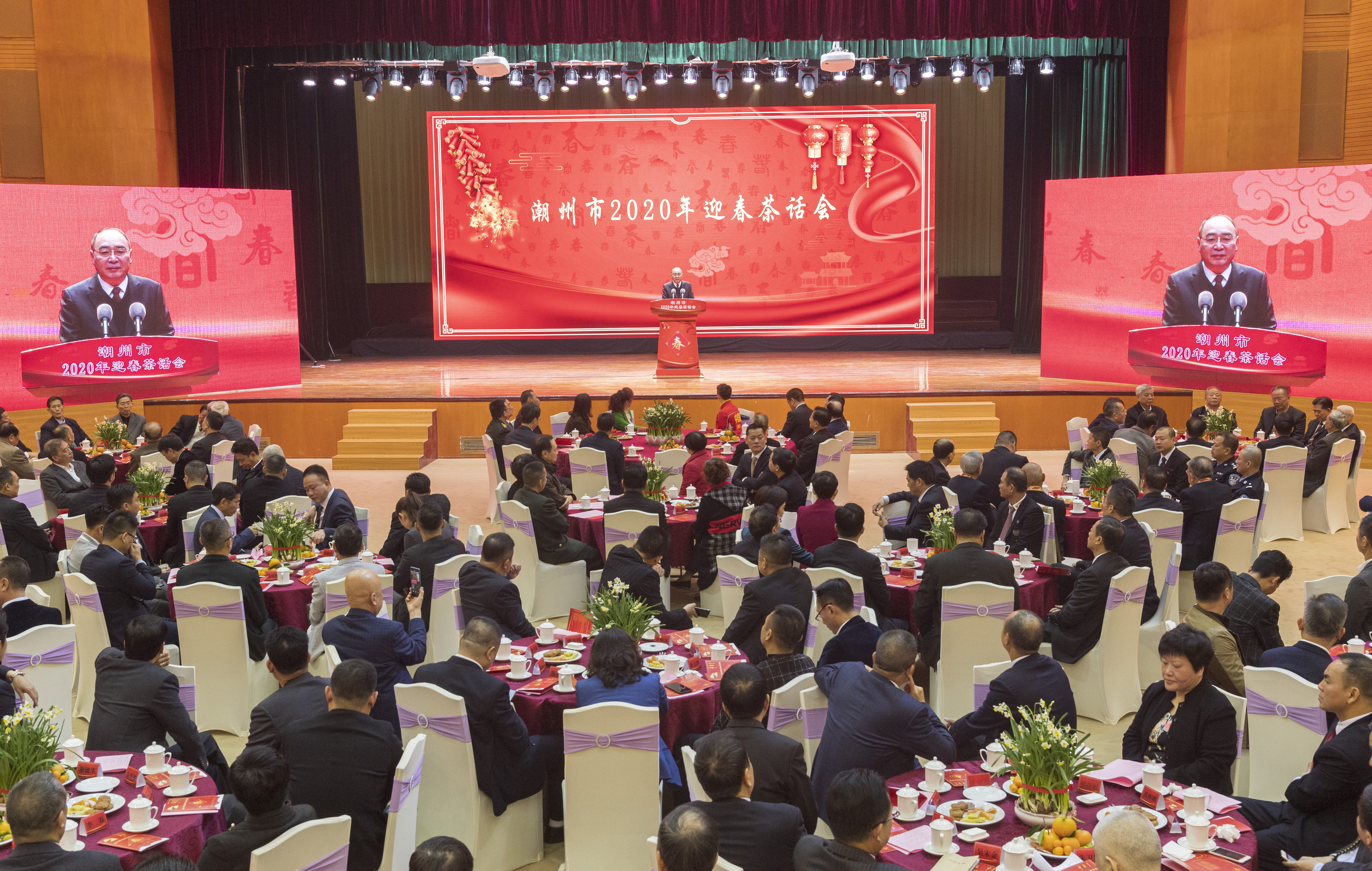 1月21日,潮州市委、市人大常委会、市政府、市政协在市党政机关会堂举行潮州市2020年迎春茶话会。全市各行各业、各条战线代表欢聚一堂,畅谈旧岁,同贺新春,共展未来,为推动经济社会高质量发展、加快打造沿海经济带上的特色精品城市营造和谐团结的良好氛围。潮州市委书记李雅林作讲话,潮州市市长殷昭举主持茶话会。