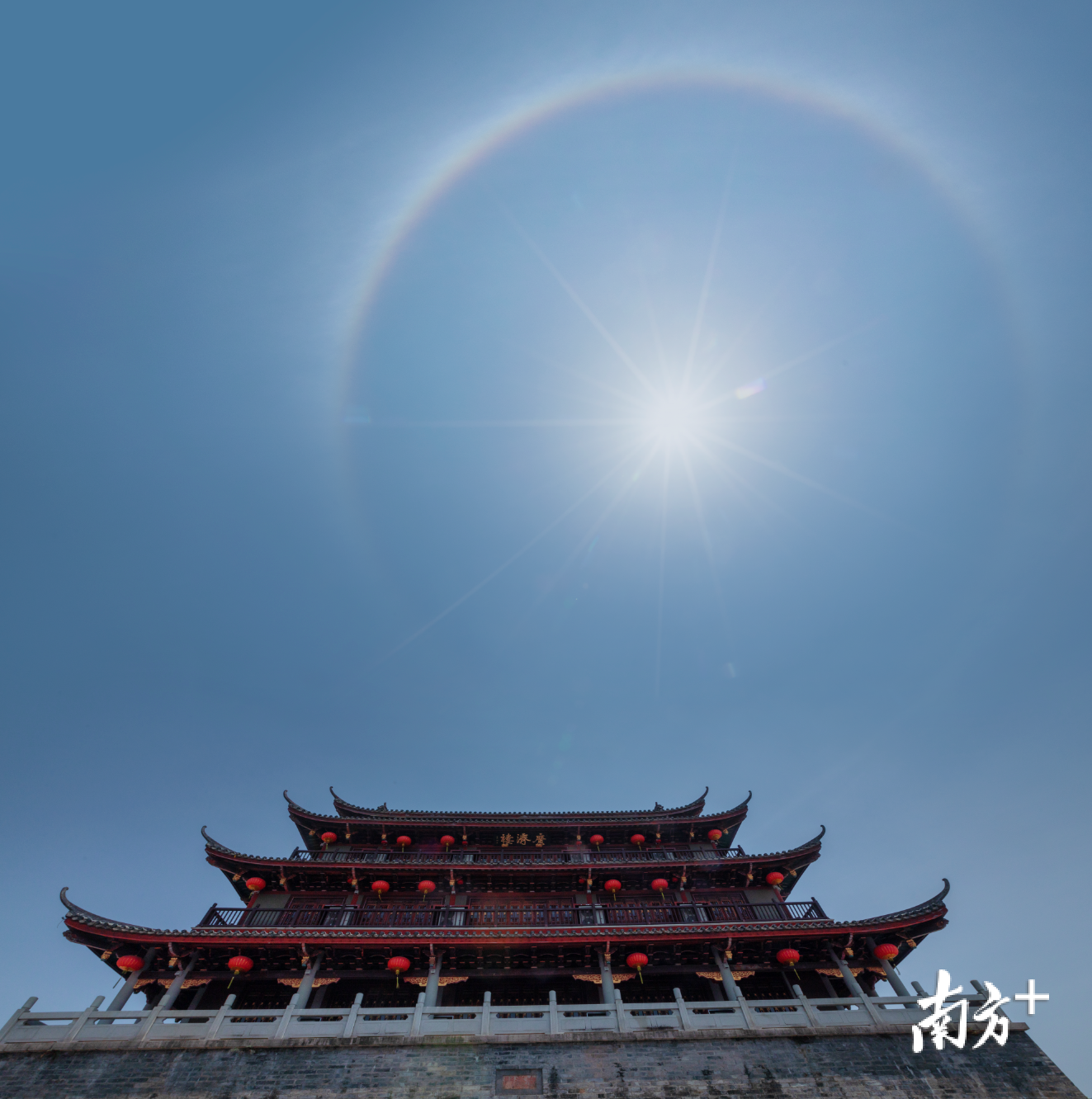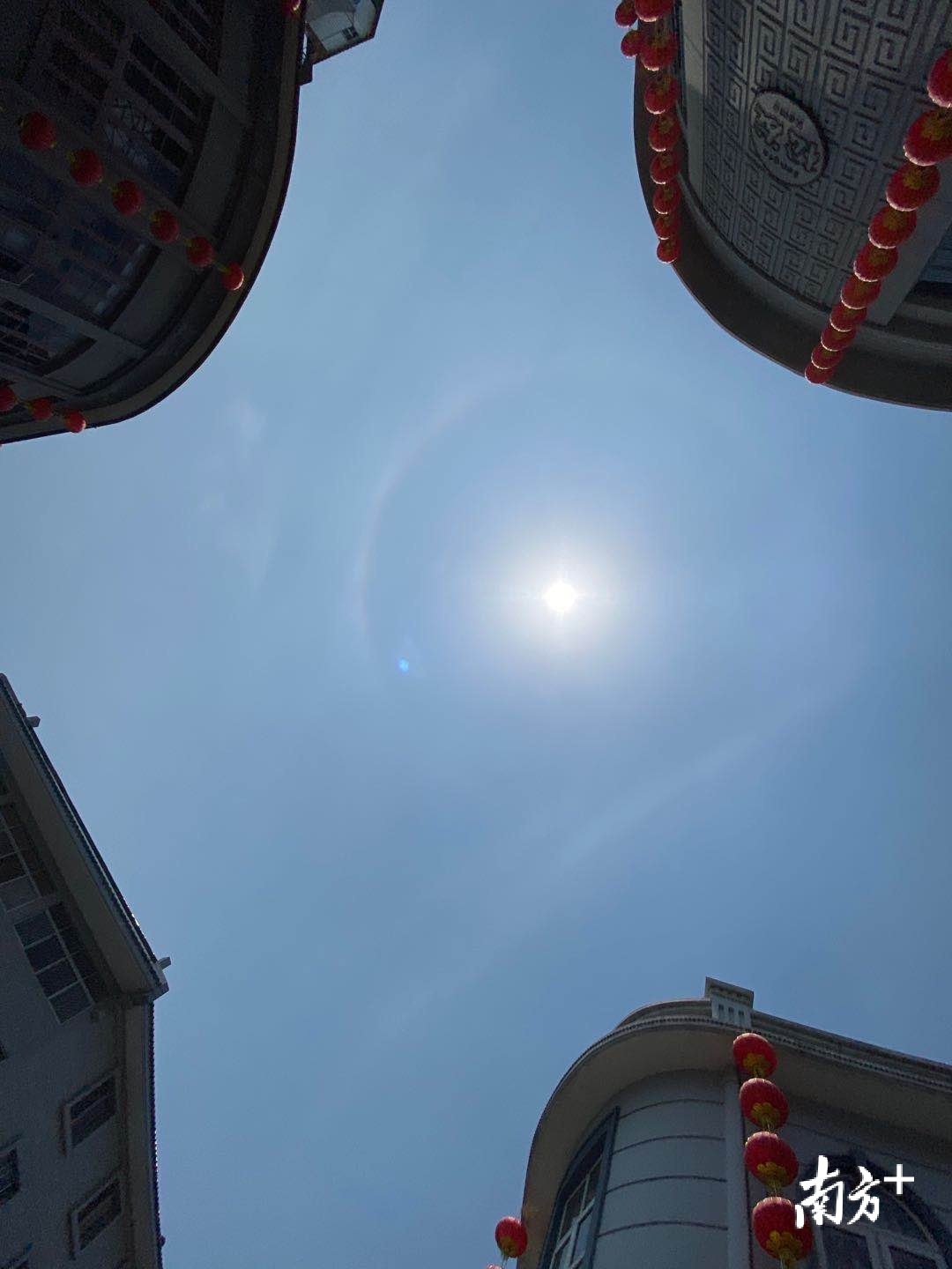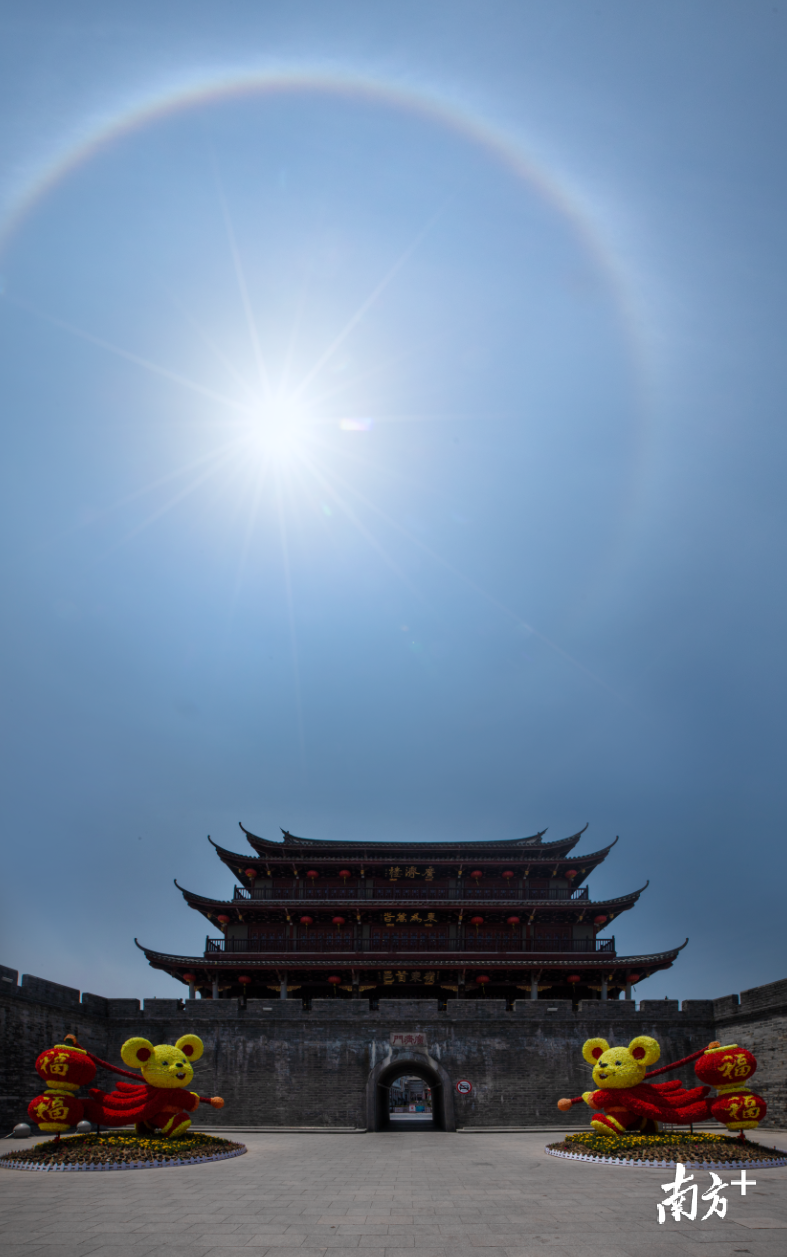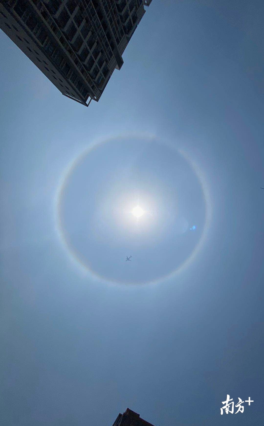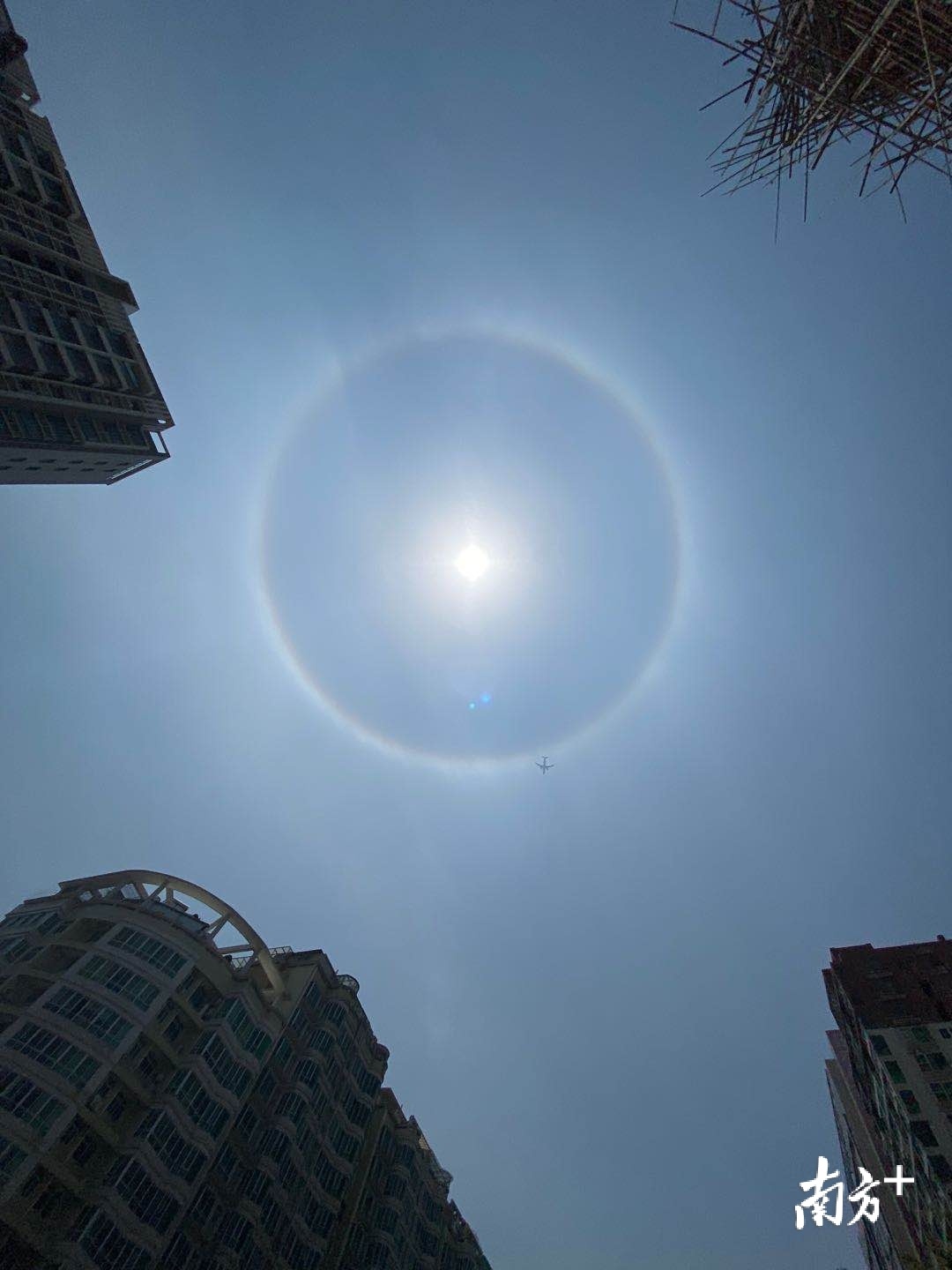 4月16日中午,潮州市区上空出现日晕景观。摄影师林文强拍下广济楼与日晕同框的美丽一景,同时他还捕捉到一架飞机正好穿过日晕。