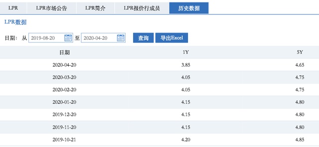 根据央行官网9时30分发布的最新消息,中国人民银行授权全国银行间同业拆借中心公布,2020年4月20日贷款市场报价利率(LPR)为:1年期LPR为3.85%,5年期以上LPR为4.65%。以上LPR在下一次发布LPR之前有效。