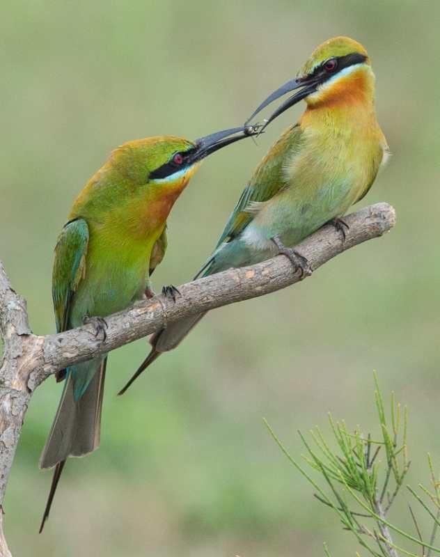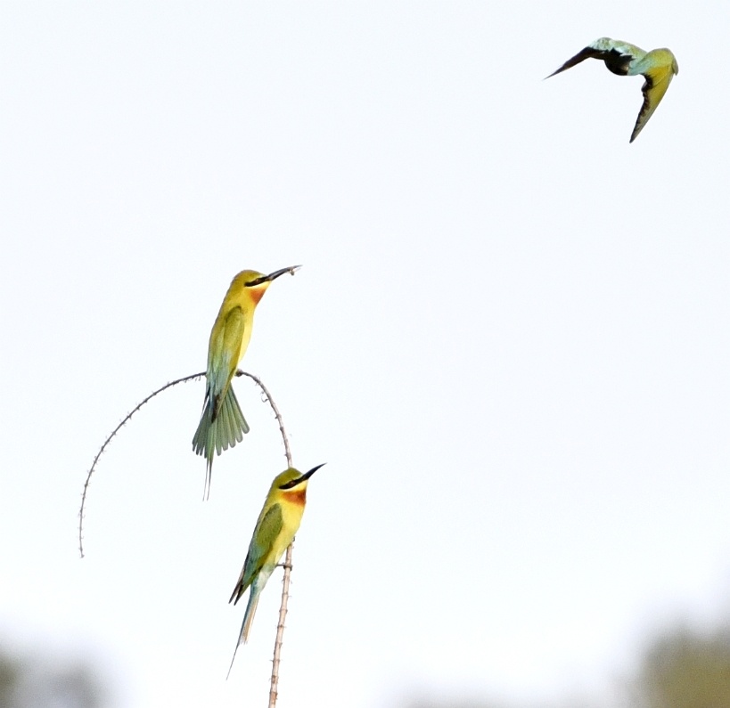 在柘林镇金狮湾附近的小旗山坡,可见数千只栗喉蜂虎在此栖息,它们时而在空中盘旋飞舞,时而落在枝头上歇脚。据饶平县柘林镇林业站工作人员介绍,栗喉蜂虎每年4-6月份就会飞来饶平县筑巢安家和繁殖,直到七月份才逐渐离开。栗喉蜂虎对筑巢环境要求很高,要找到满足这些条件的区域并不容易。