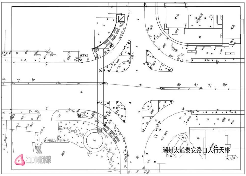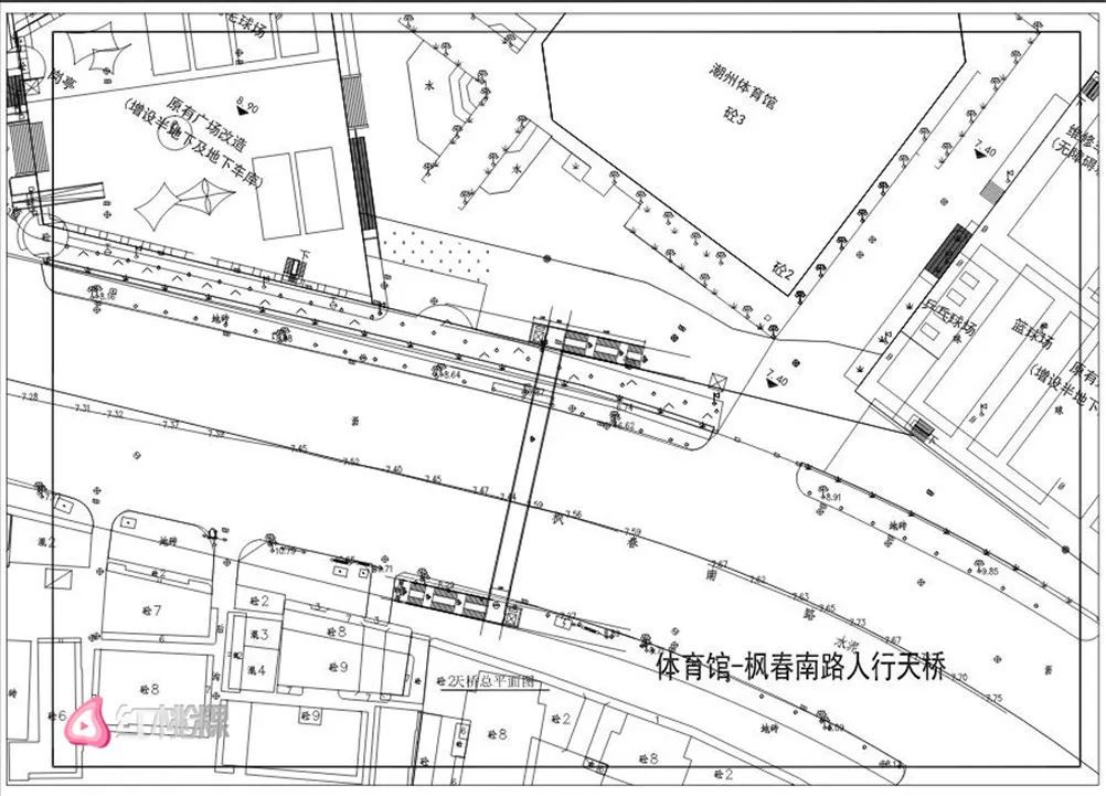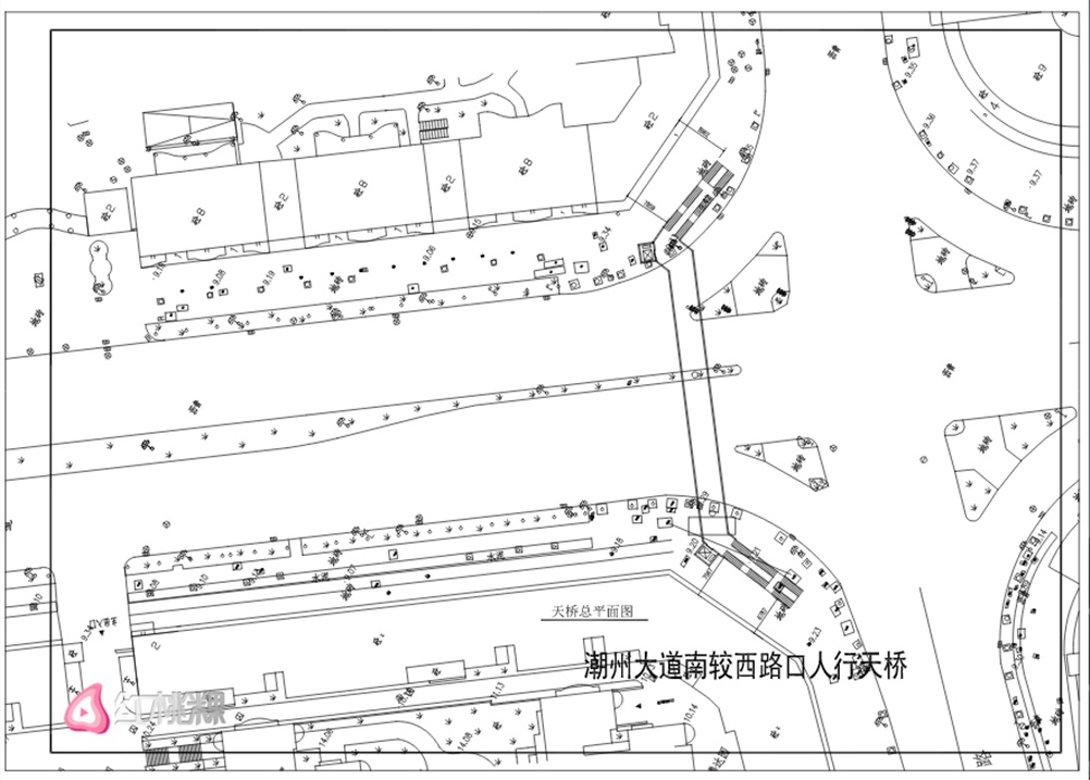 采用钢结构两跨箱型梁结构,桩基础,跨度为18+24米,桥面宽度4米,桥底净空5米;桥面铺贴花岗岩石板,采用中式栏杆,配置辅助照明;天桥两端步行梯坡度1:2,设置无障碍电梯。