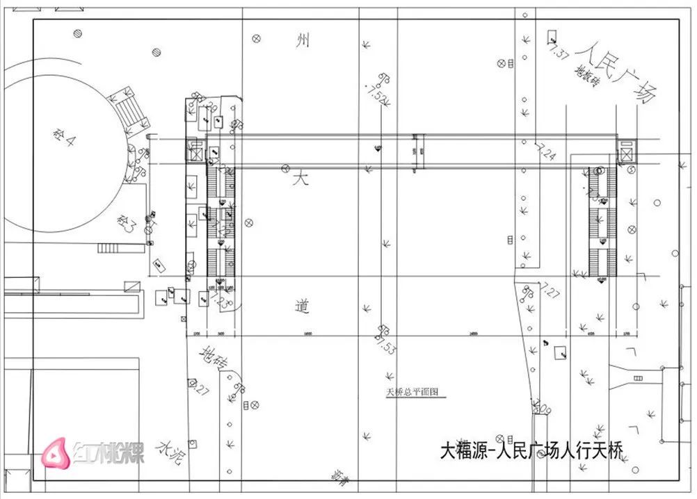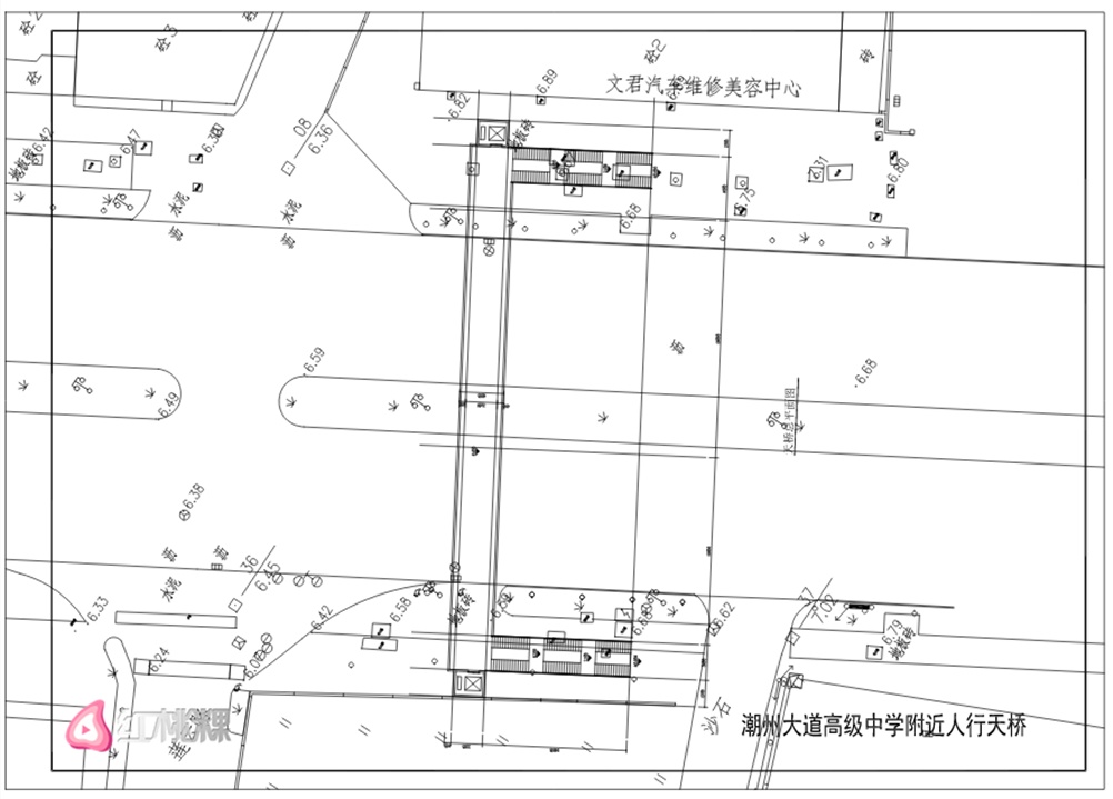 采用钢结构两跨箱型梁结构,桩基础,跨度为21+24米,桥面宽度4米,桥底净空5米;桥面铺贴花岗岩石板,采用中式栏杆,配置辅助照明;天桥两端步行梯坡度1:2,设置无障碍电梯。