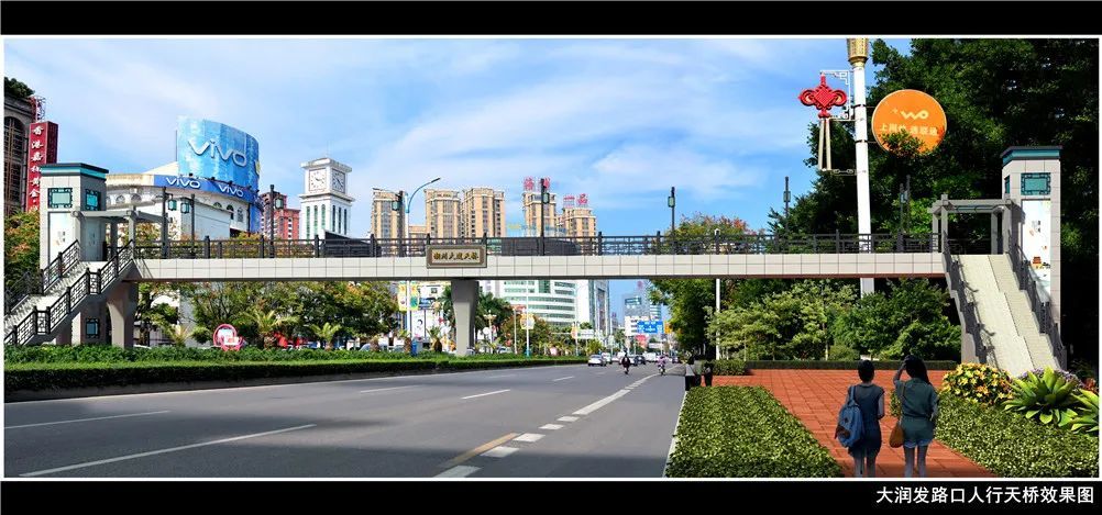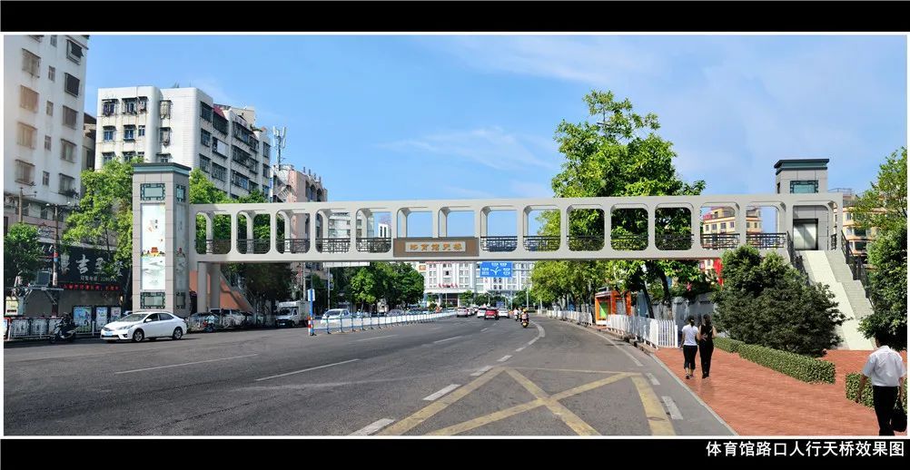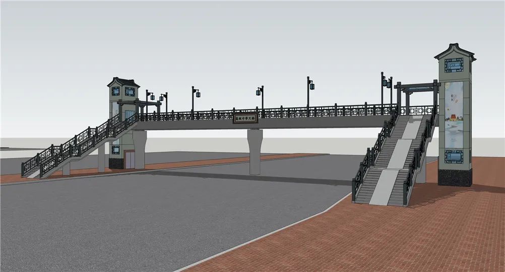 采用钢结构两跨箱型梁结构,桩基础,跨度为24+24米,桥面宽度4米,桥底净空5米;桥面铺贴花岗岩石板,采用中式栏杆,配置辅助照明;天桥两端步行梯坡度1:2,设置无障碍电梯。