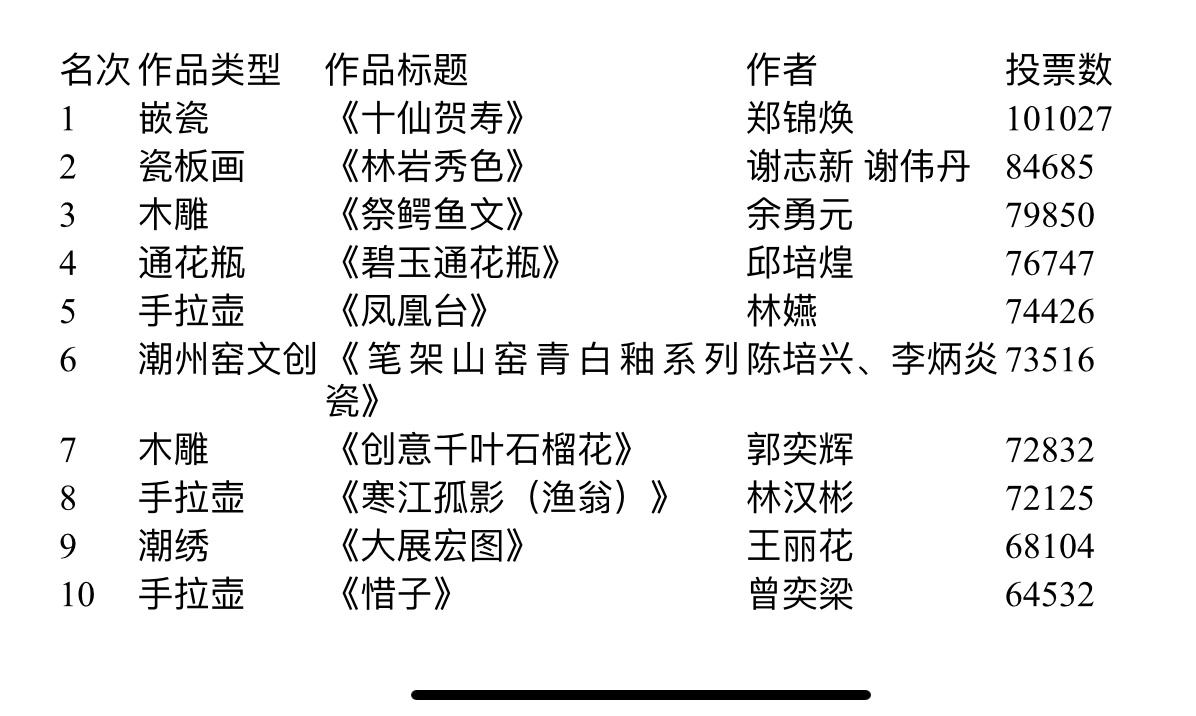 经过多日网上角逐,7月25日夜间,市民最喜爱的 2020 广东(潮州)工艺美术十大精品评选结果出炉。麦秆画、木雕、手拉壶、花灯、玉器等潮州传统工艺美术品共有86件作品参与评选,本次评选活动以公众网络投票的方式进行,总投票数共计1149269人次。最终,嵌瓷《十仙贺寿》等10件作品胜出。