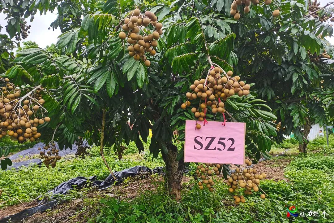 看起来非常满意,现场的树长得好,果结得多,味道也很好。我们刚才在室内见识了15个新品种,包括新品系,特别是今天大家吃到FD310,它的优点非常突出,特别甜、特别香、产量高、果实大。接下来,我们还要推荐的是龙眼跟荔枝的组建杂种,就是SZ52号,它是石硖龙眼做母本,紫娘喜荔枝做副本所培育出来的新品系, 它的长势健壮,结果非常大串,一串约有2.3斤,而且品质非常好。
