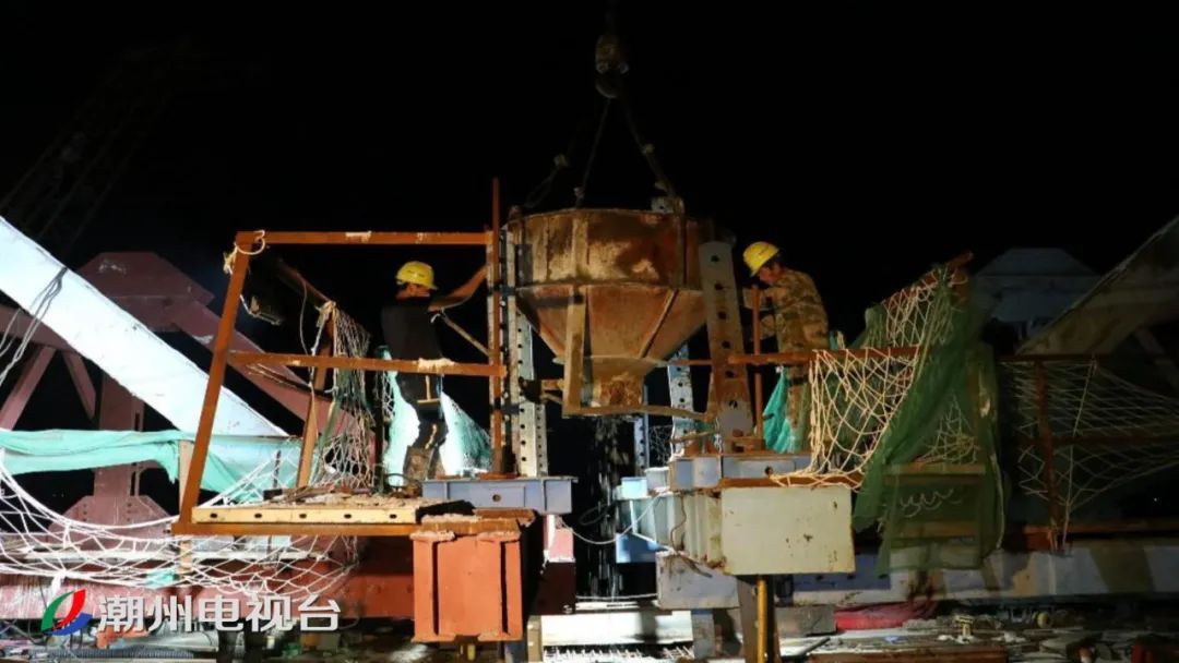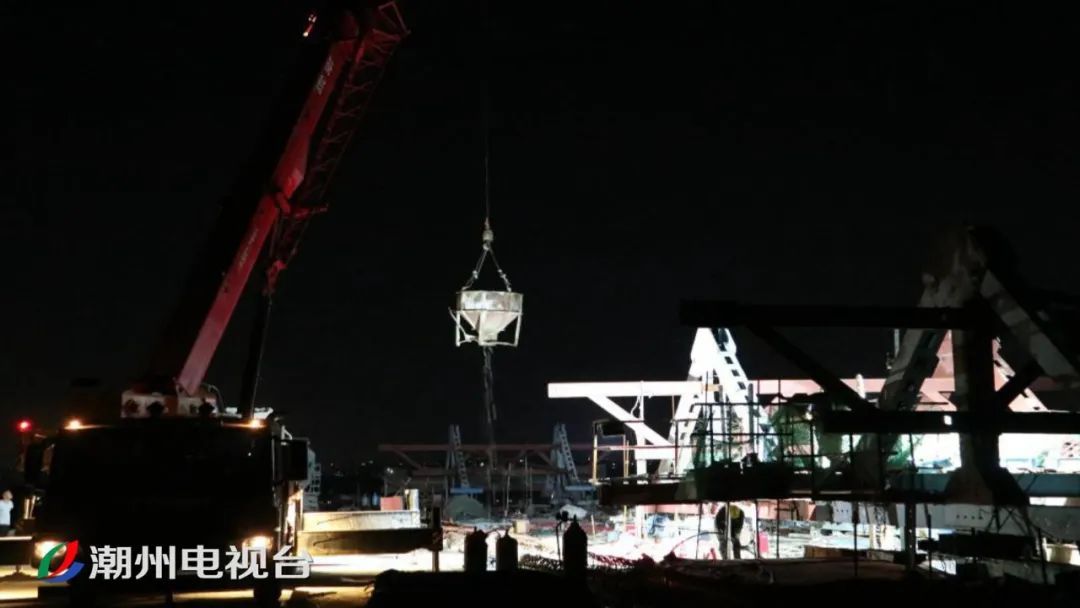 我现在是在潮汕环线高速二标段韩江东特大桥,今天0点58分,韩江东特大桥右幅合拢段开始浇筑,于3点09分正式浇筑完成,这意味着韩江东特大桥正式合龙,也标志着潮汕环线高速目前已全线贯通。