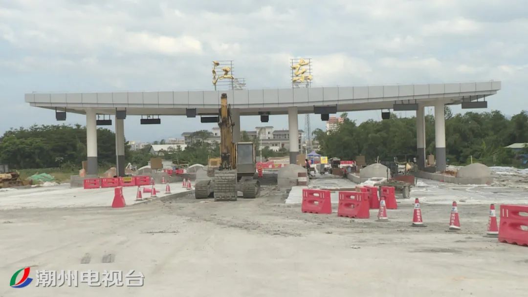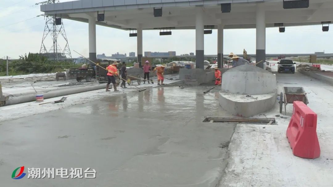 潮汕环线高速土建二标段设有两处互通,分别位于磷溪镇和江东镇,目前,江东收费站的收费亭已基本建设完成,工人们正在对最后一条车辆通道进行混凝土浇筑。