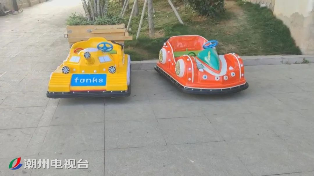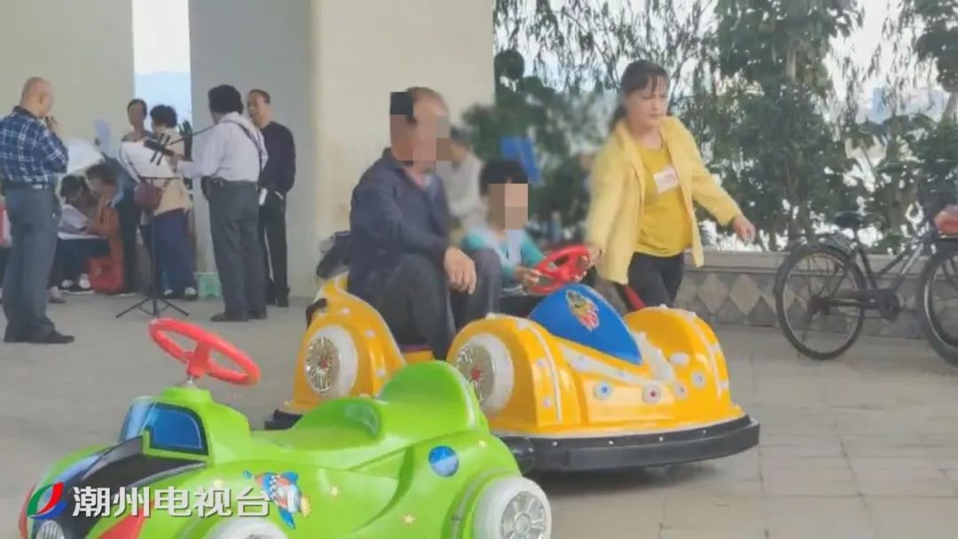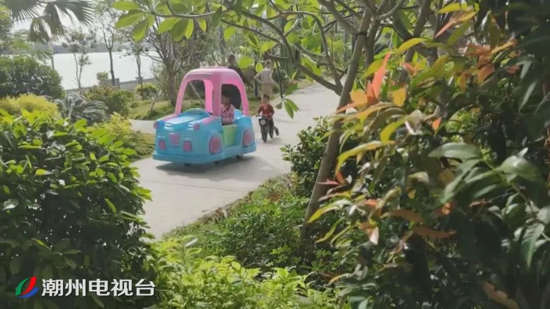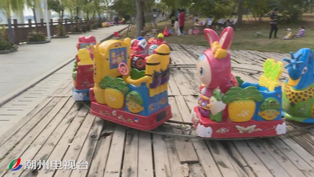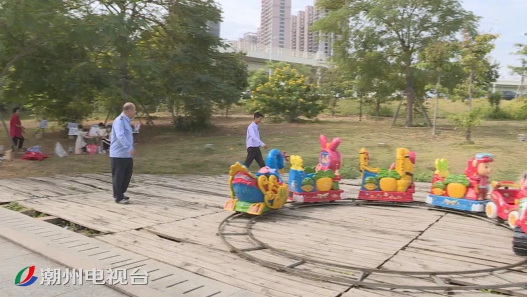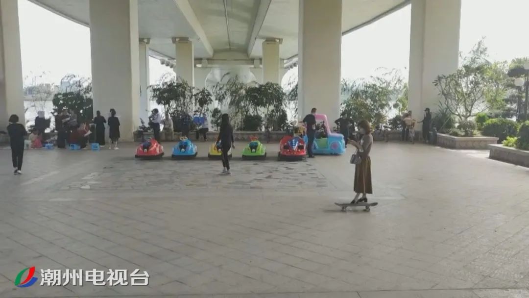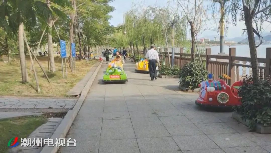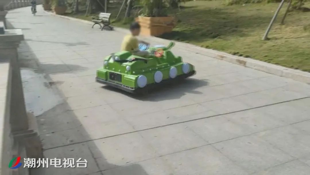 适逢周日,潮州大桥下靠近南堤路一侧的沿江步行道游人众多。人流量大,“车”流量也不小。十余辆电动玩具车被零零散散地放置在沿江步道和附近的空地上,记者采访期间,陆续有市民带着孩子前来体验驾驶。