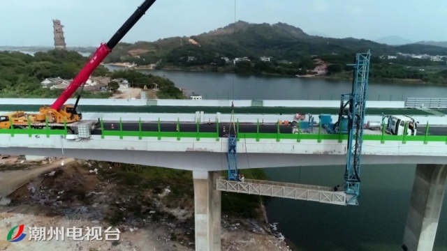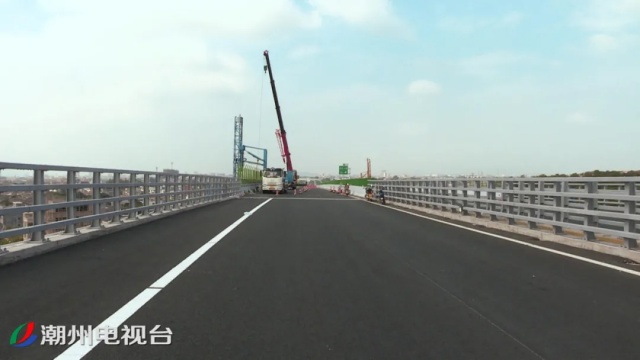 我现在是来到了韩江东特大桥的桥面上,由于韩江东特大桥是跨越韩江,施工难度比较大,是二标工程的一个重点工程,在现场可以看到,现在沥青路面已经摊铺完成,工人正在进行标线的施划以及防护网的安装。在今天凌晨,同时还有15辆大货车开上了这个桥面,进行了一项非常重要的静载试验。