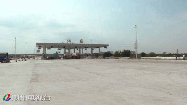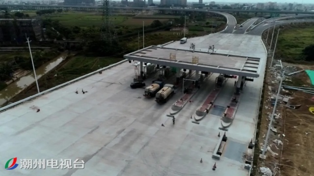 现在我是来到了潮汕环线高速的江东收费站,现场可以看到整个收费亭已基本建成,现在也进入了收尾阶段。届时潮汕环线高速正式通车之后,江东镇及周边的群众就可以通过这个收费站进入高速,前往澄海或者是高铁站等地,大大缩短了出行时间,十分便利。那现在就跟随我们的无人机镜头,一起来看看现阶段的潮汕环线高速。