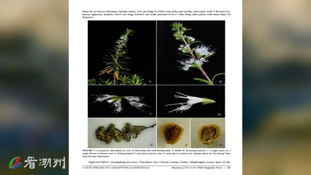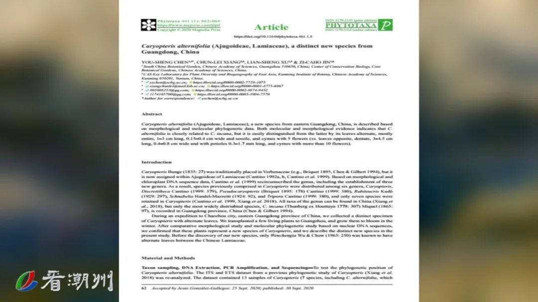 后经中科院华南植物园陈又生教授及其团队的研究及分子系统学分析,证实了这种山涧野草是一种植物新种,并在国际生物分类权威期刊《Phytotaxa(植物分类)》上正式发表论文,描述并命名了这一唇形科莸属新种。原本无人问津的山涧小草,从此也有了它的专属名字——潮州莸。