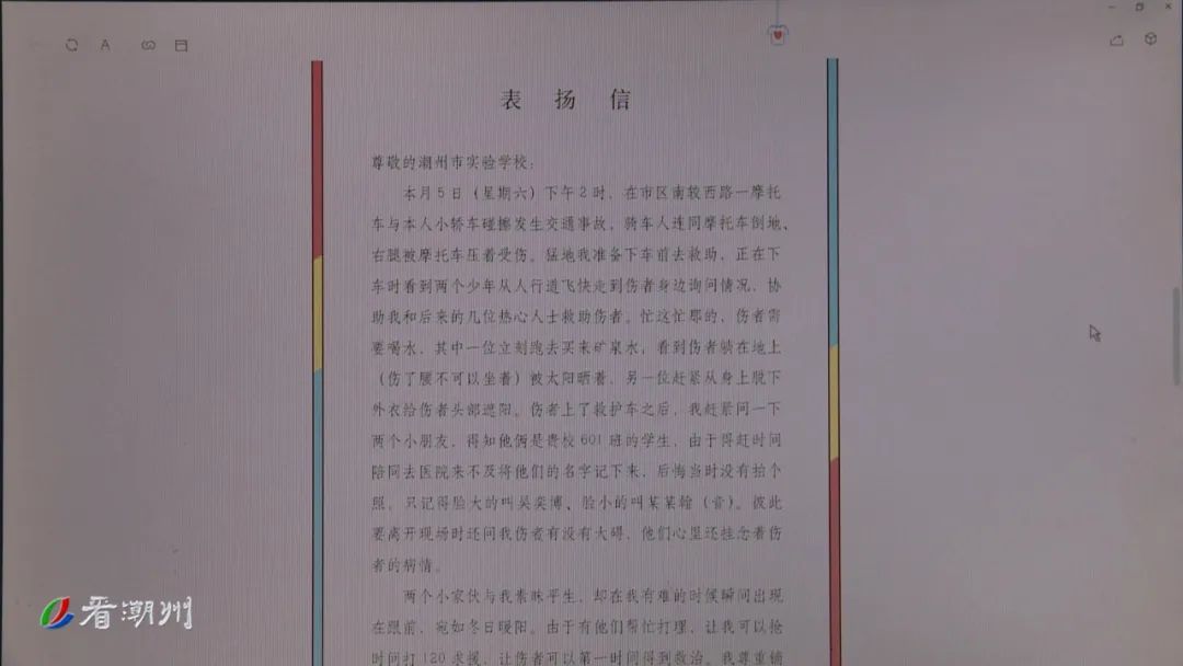 近日,市实验学校和湘桥区厦寺小学都收到了一封表扬信和一封感谢信,原来是两所学校的三名学生在上月初的一宗车祸现场,热心协助照顾伤者,感动了事故双方当事人。
