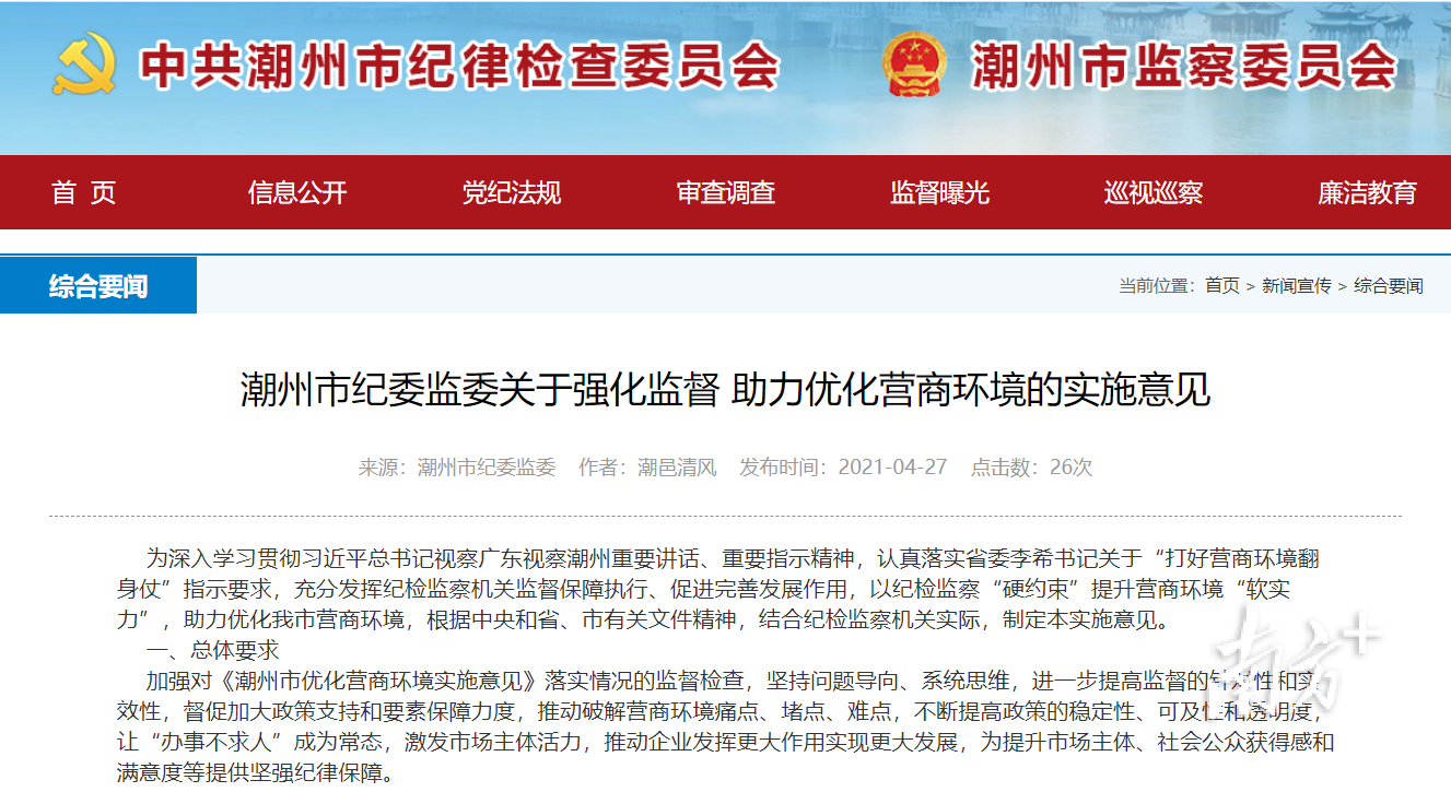 近日,潮州市纪委监委出台《潮州市纪委监委关于强化监督 助力优化营商环境的实施意见》(下称《实施意见》),为潮州进一步优化营商环境护航助力。