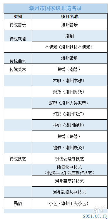 6月10日,国务院公布第五批国家级非物质文化遗产代表性项目名录(共计185项),其中潮州2项入选:潮州菜烹饪技艺和粤绣(珠绣)。至此,潮州已有17项国家级非遗项目。