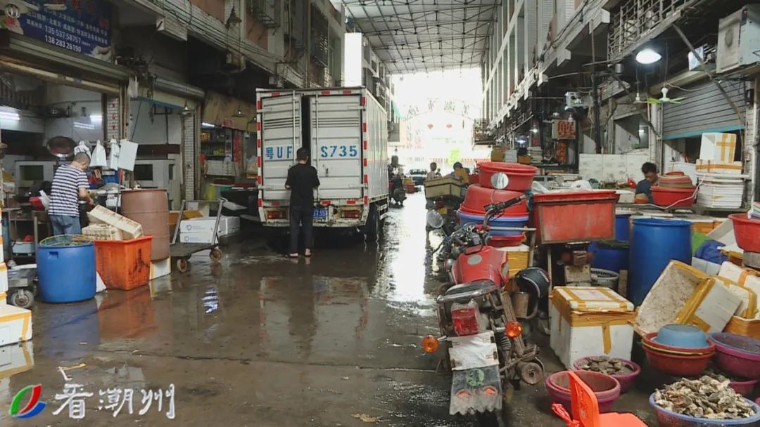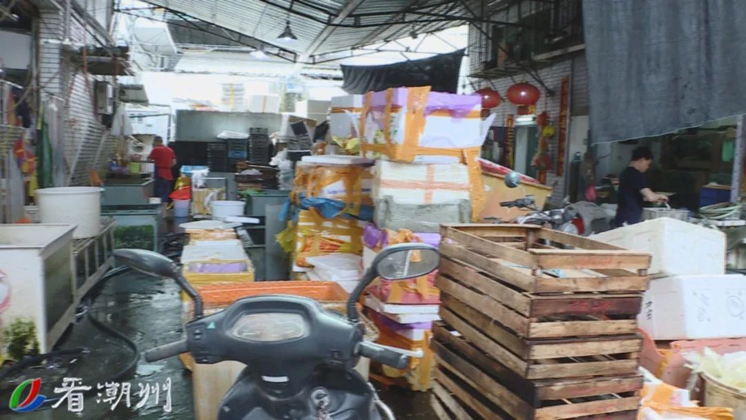 市场内基本都是经营水产品的商铺,水产区脏乱差现象普遍存在。地上污水横流,到处湿漉漉。经营户的杂物乱堆乱放,装海鲜的泡沫箱、木箱层层叠叠,高高堆起。有群众反映,粤潮市场垃圾收运设施配套不完善,经营户将产生的垃圾乱丢乱弃,保洁清理不及时,而且下水道不通畅,特别容易积水。