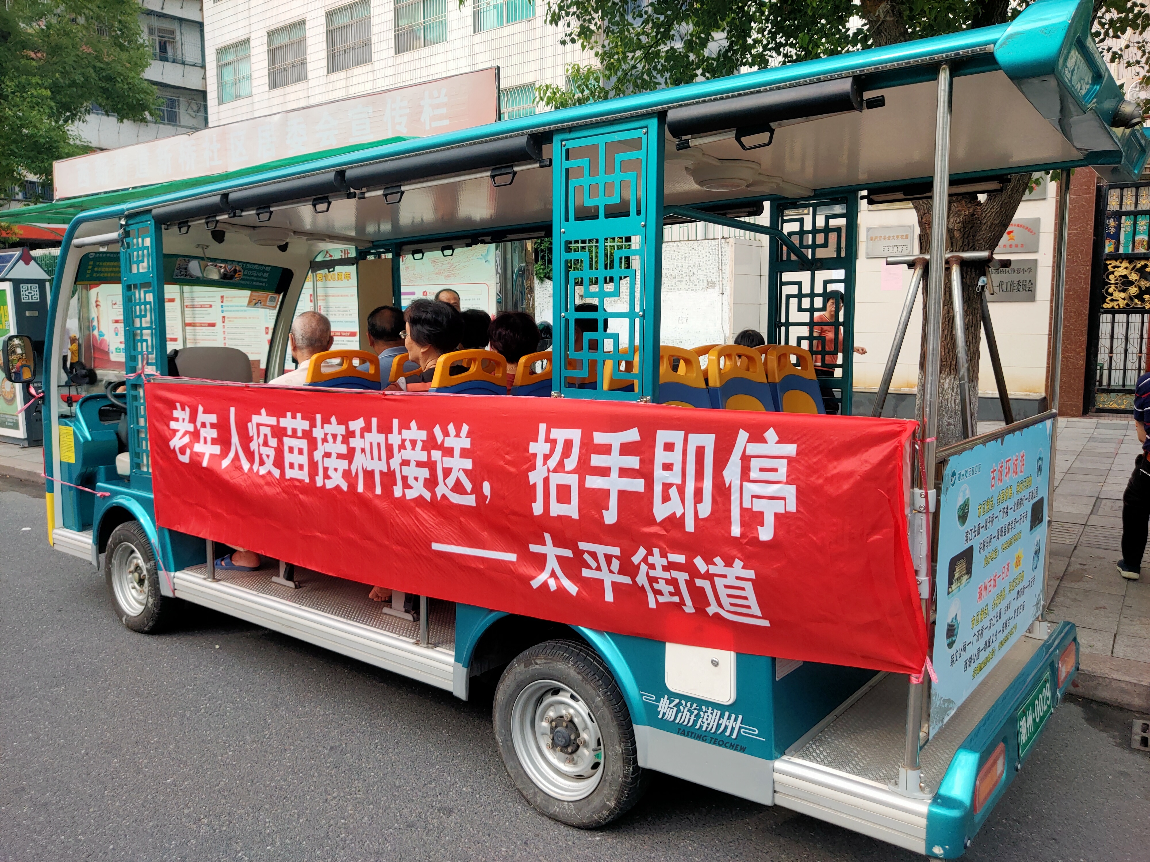 “老年人疫苗接种接送,招手即停。”这是潮州市湘桥区太平街道接种疫苗专车上的标语。红色横幅挂在绿色的接送车上,显得特别耀眼。贴心的服务,让这辆专送车成了夏日里的一股凉风,吹进居民心中。