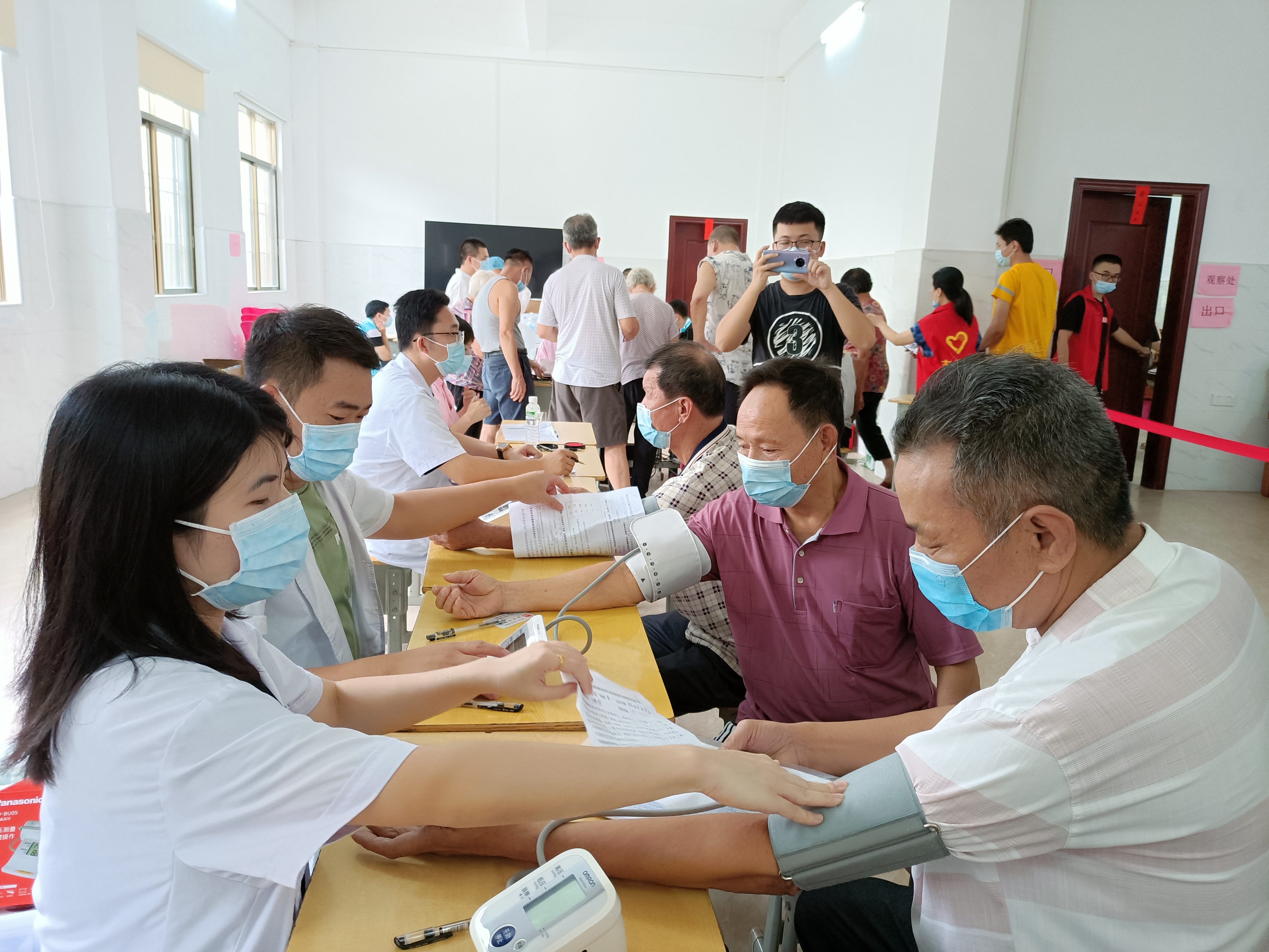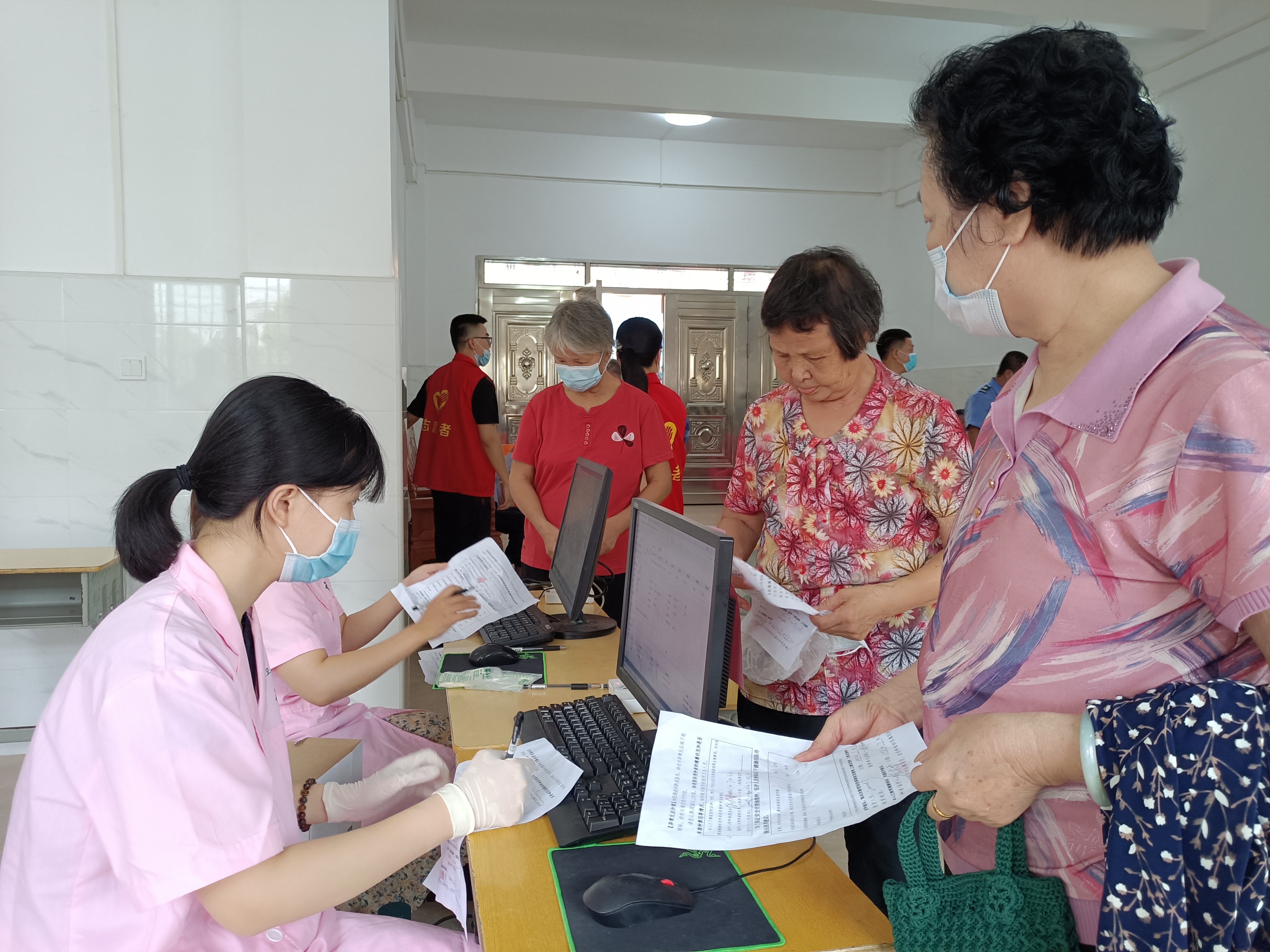 老年人们接种前会进行体检,如测血压等。