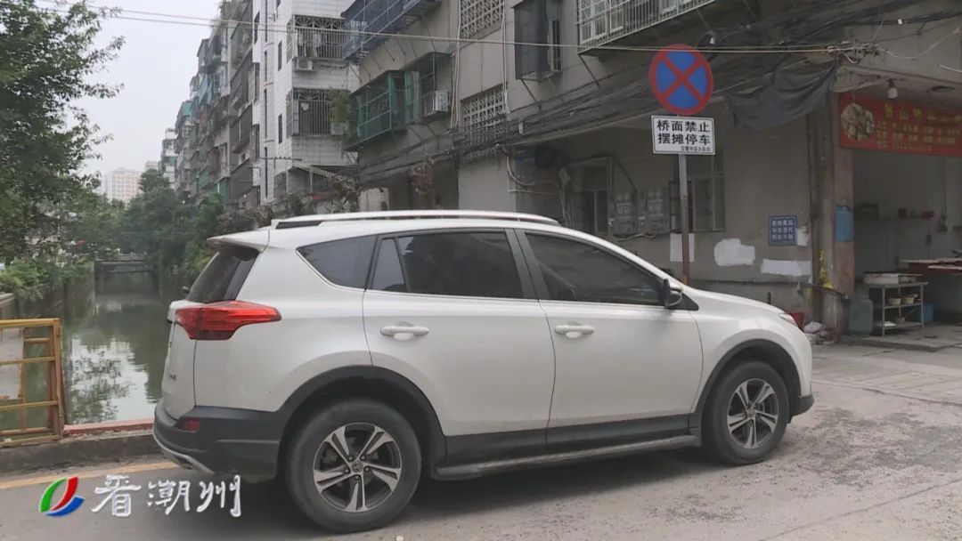 在附近的桥面上,设有“禁止摆摊停车”的警示牌,但仍有人我行我素,将汽车随意停放在桥面两侧。事实上,汽车乱停乱放在整条景荣路非常普遍,有的见缝插针停在路边,这几辆汽车甚至停放在道路中间,严重影响正常通行。