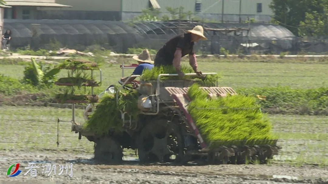潮安区金石镇潘厝村这片农田里,插秧机正来回穿梭作业,“机走苗下”,一株株秧苗整齐有序插入水田里。
