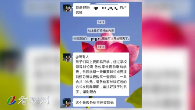 事主许女士:通过后他就发一条信息,说新学期开始,学生要收一些费用,198元。我还问他有没有包括校服,他就回答我有。我还问他那缴完是不是就不用去学校缴,因为我们平时这些都是去学校缴,他就回答我是的。然后他就发了一个二维码给我,我就把钱转过去。