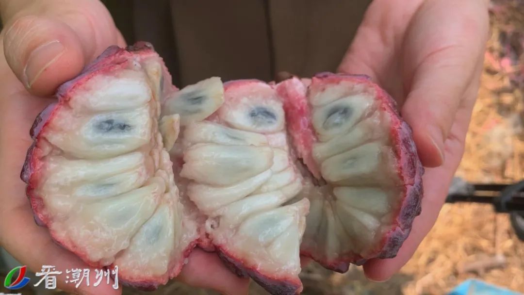 记者彭晓冰&果农朱文海:吃完林檎,中秋还有一种水果是一定要吃的,什么呢?去看看。大家看到了吧,我们第二种要介绍的水果就是柚子。我现在所在的位置是饶平县上饶镇茂芝社区的柚子园,据说这种柚子还有一个非常好听的名字叫三红柚,为什么叫三红柚呢,我们请果园主人朱大哥来给我们介绍一下。朱大哥你好,这个为什么叫三红柚?(因为这种皮红瓤红肉红,口感吃起来非常清脆,甜度非常高,还有富含氨基酸,非常好吃。)那我们去切一个看看……