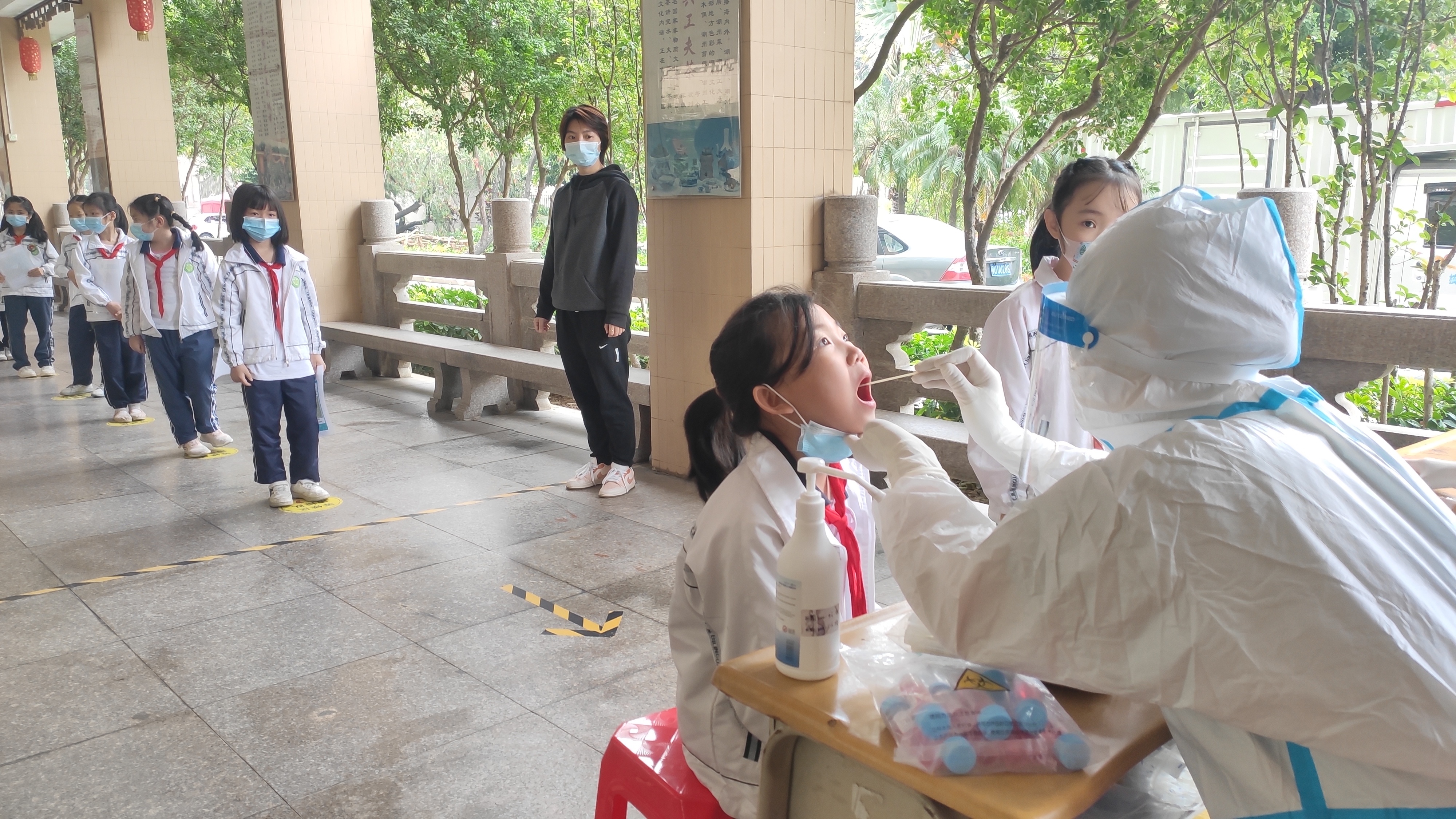 在老师们的引领下,学生们按照班别、小组有序排好队伍,医护人员俯下身子逐个为学生采集咽拭子。检测完毕后,立即按指引从指定路线回到班级;教职员工分批错峰到达采样现场,登记、样本采集、有序离场。