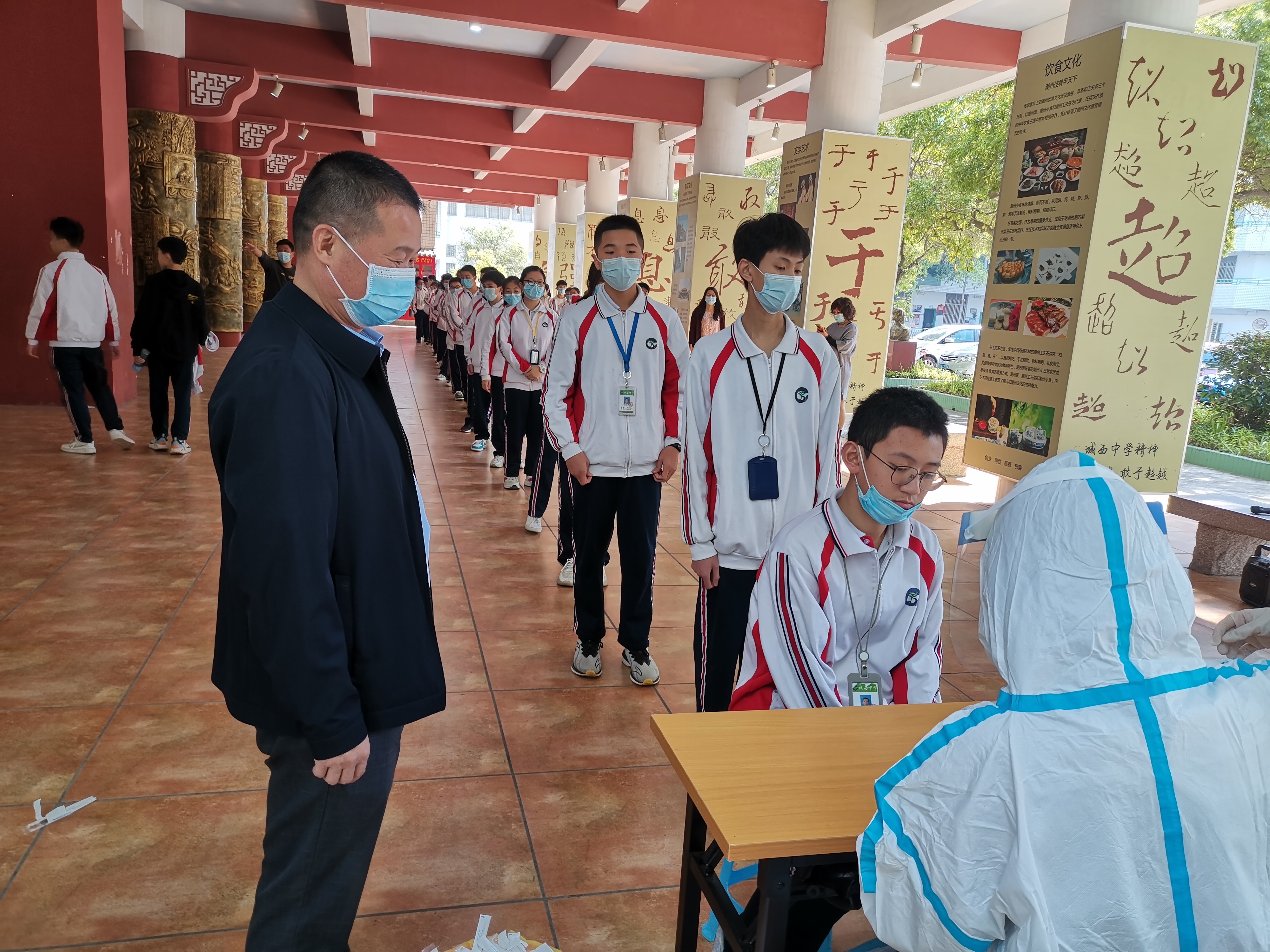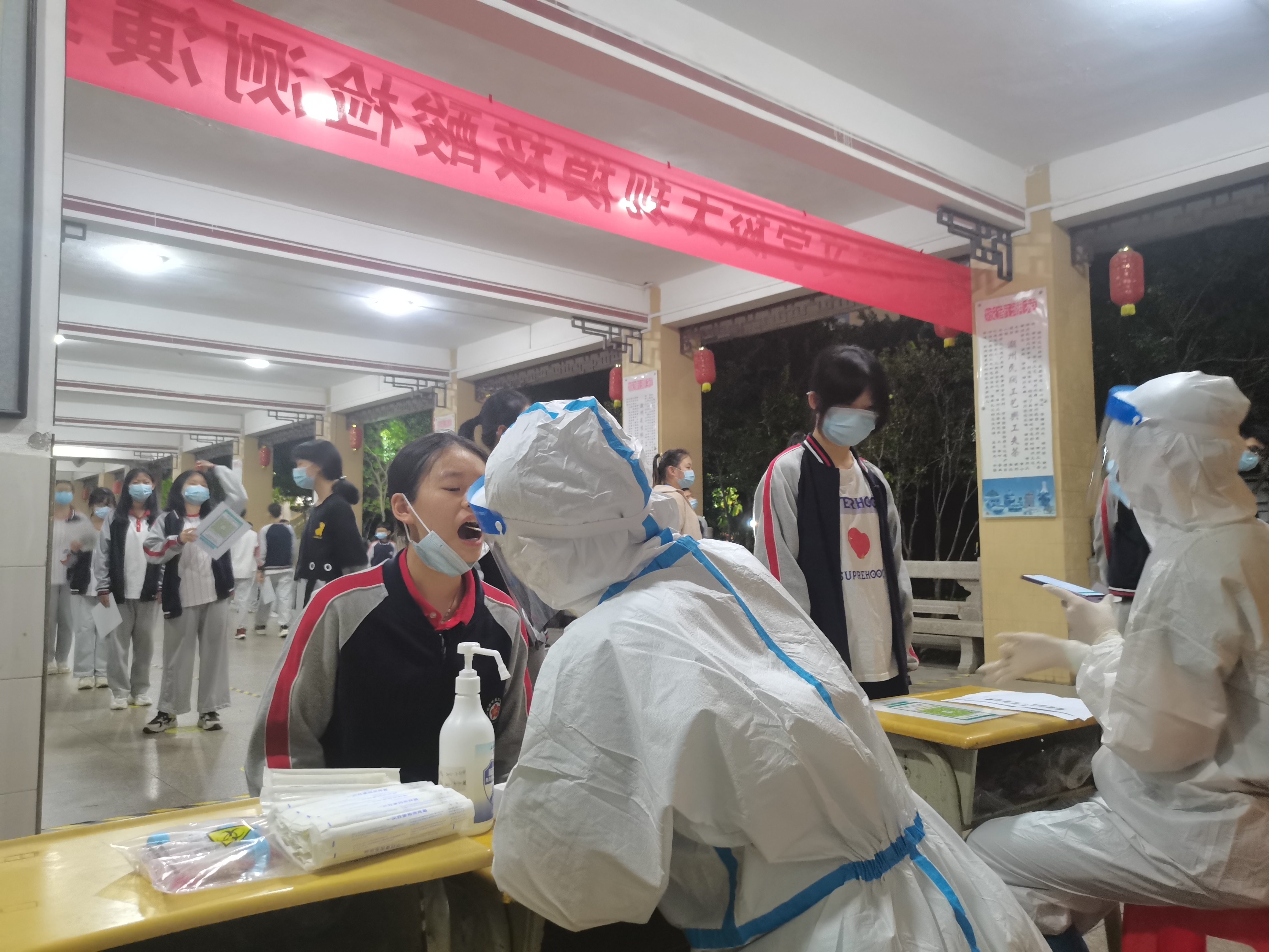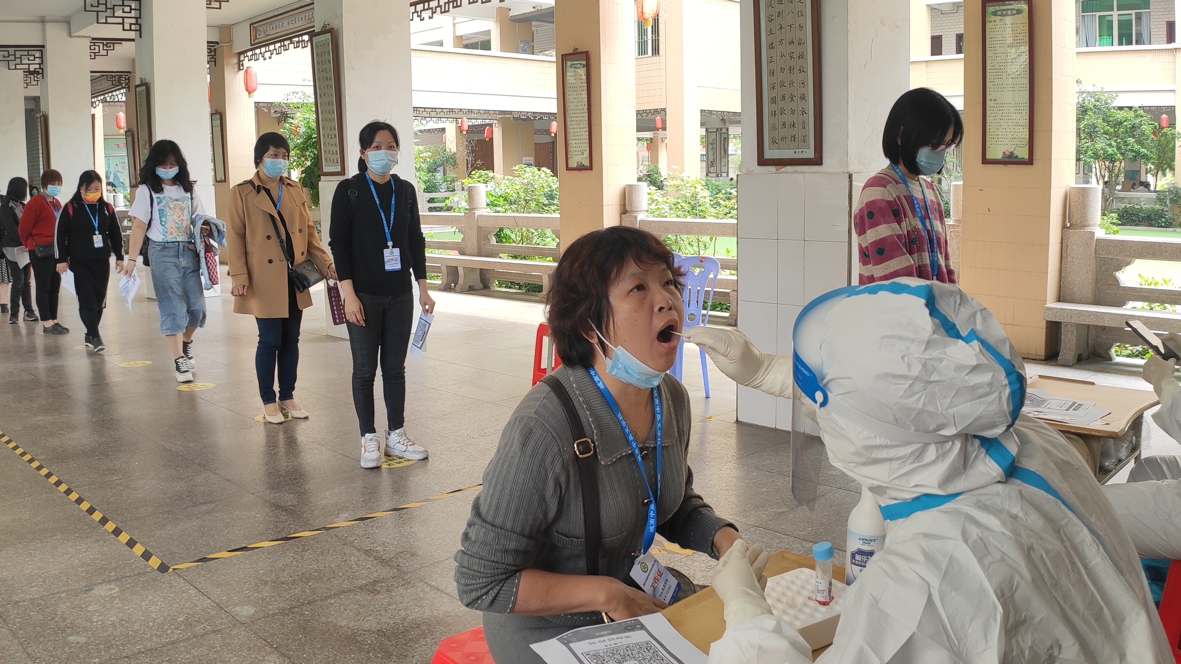 后仰、张嘴、采集样本……4月7日,潮州市城南中英文学校教师和学生有序进行核酸检测。