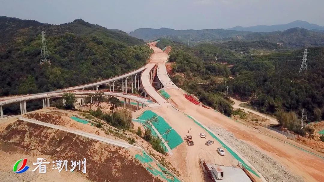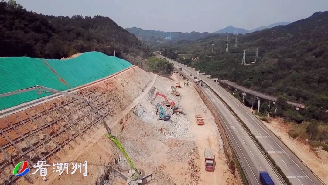 而在潮州东联络线TJ2标段铁铺东枢纽立交施工现场,关键节点汕汾高速双侧交通导改工程正在进行高边坡土石方开挖。