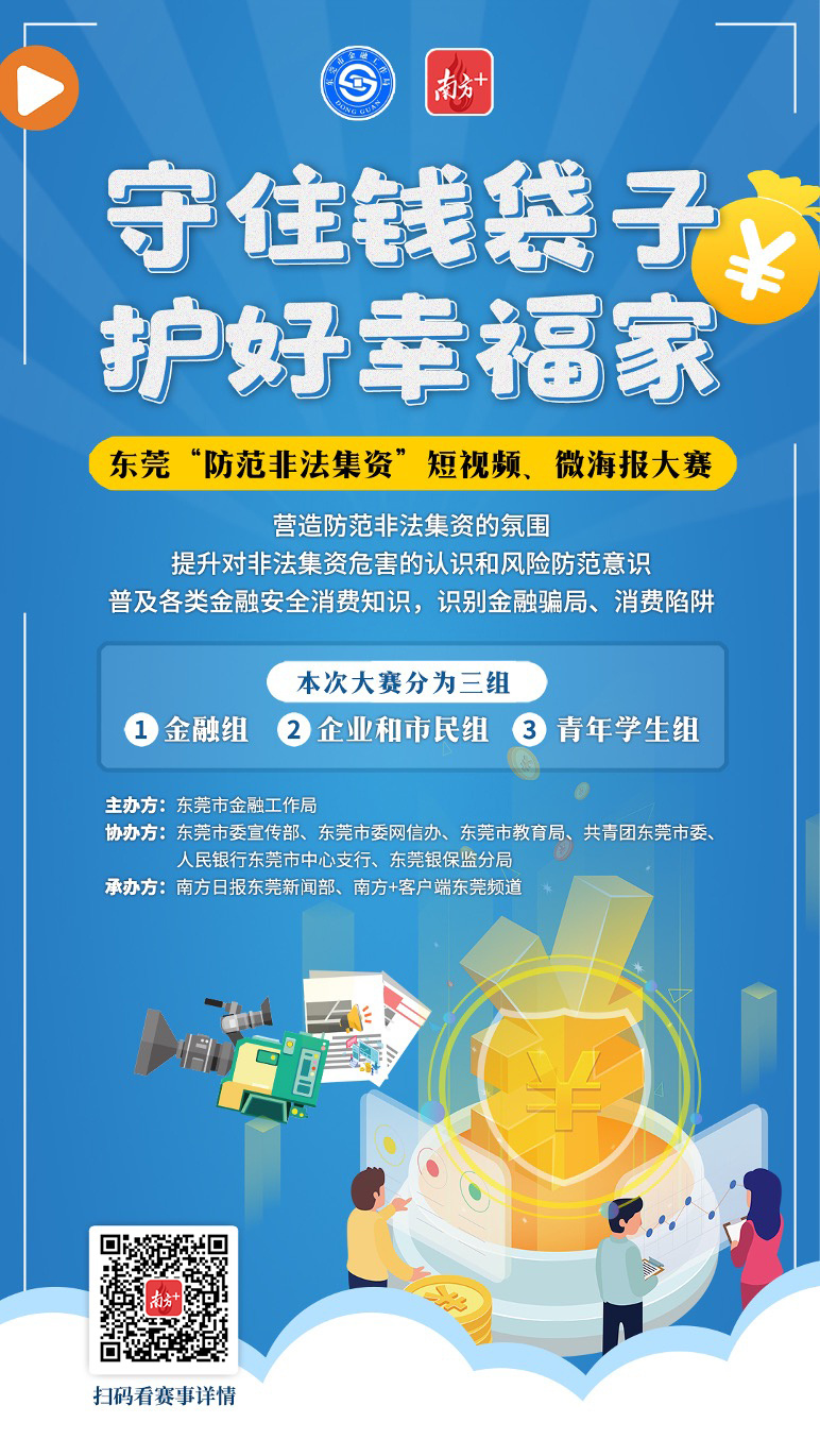 为了保护好大家的钱袋子,提高市民防范非法集资的意识,由东莞市金融工作局主办,东莞市委宣传部、东莞市委网信办、东莞市教育局、共青团东莞市委、人民银行东莞市中心支行、东莞银保监分局协办,南方日报东莞新闻部、南方+客户端东莞频道承办的东莞“防范非法集资”短视频、微海报大赛正式启动了!