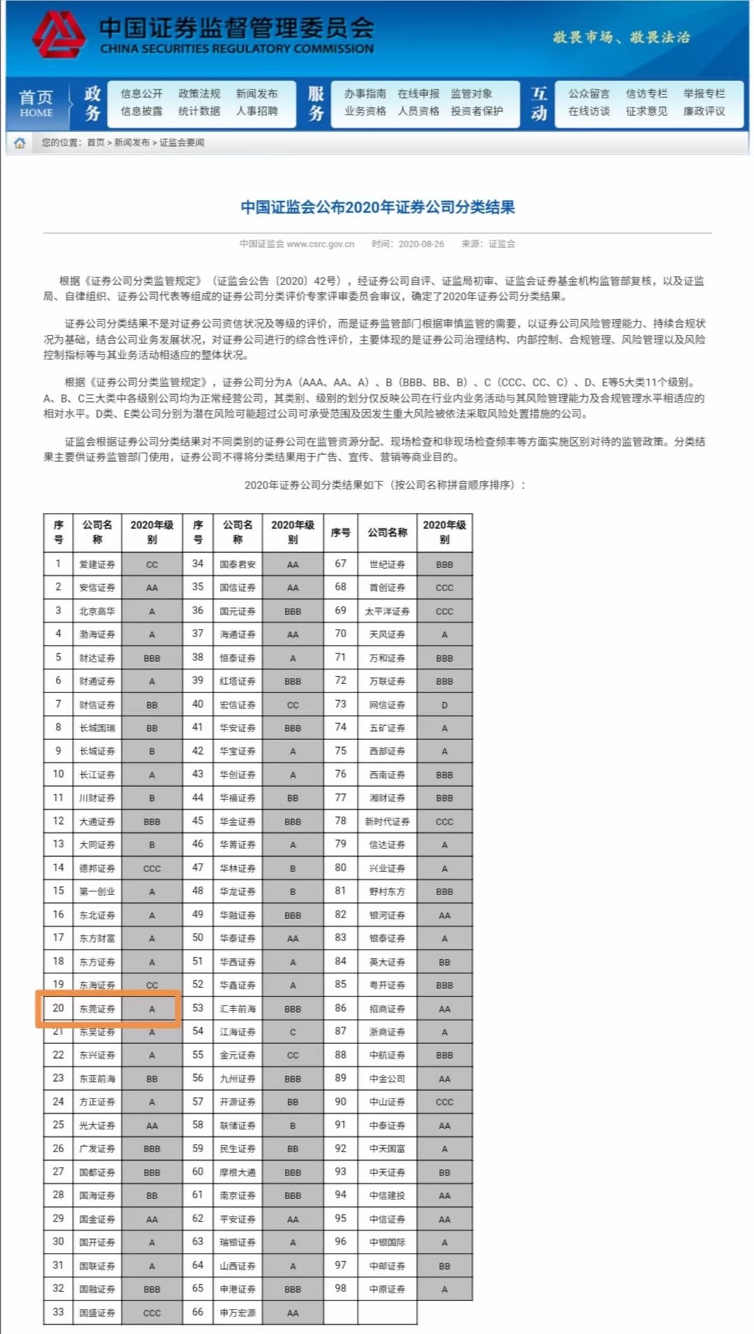 8月26日,中国证监会公布2020年证券公司分类结果公布,对全国98家证券公司进行评级,其中东莞证券被评为A级。