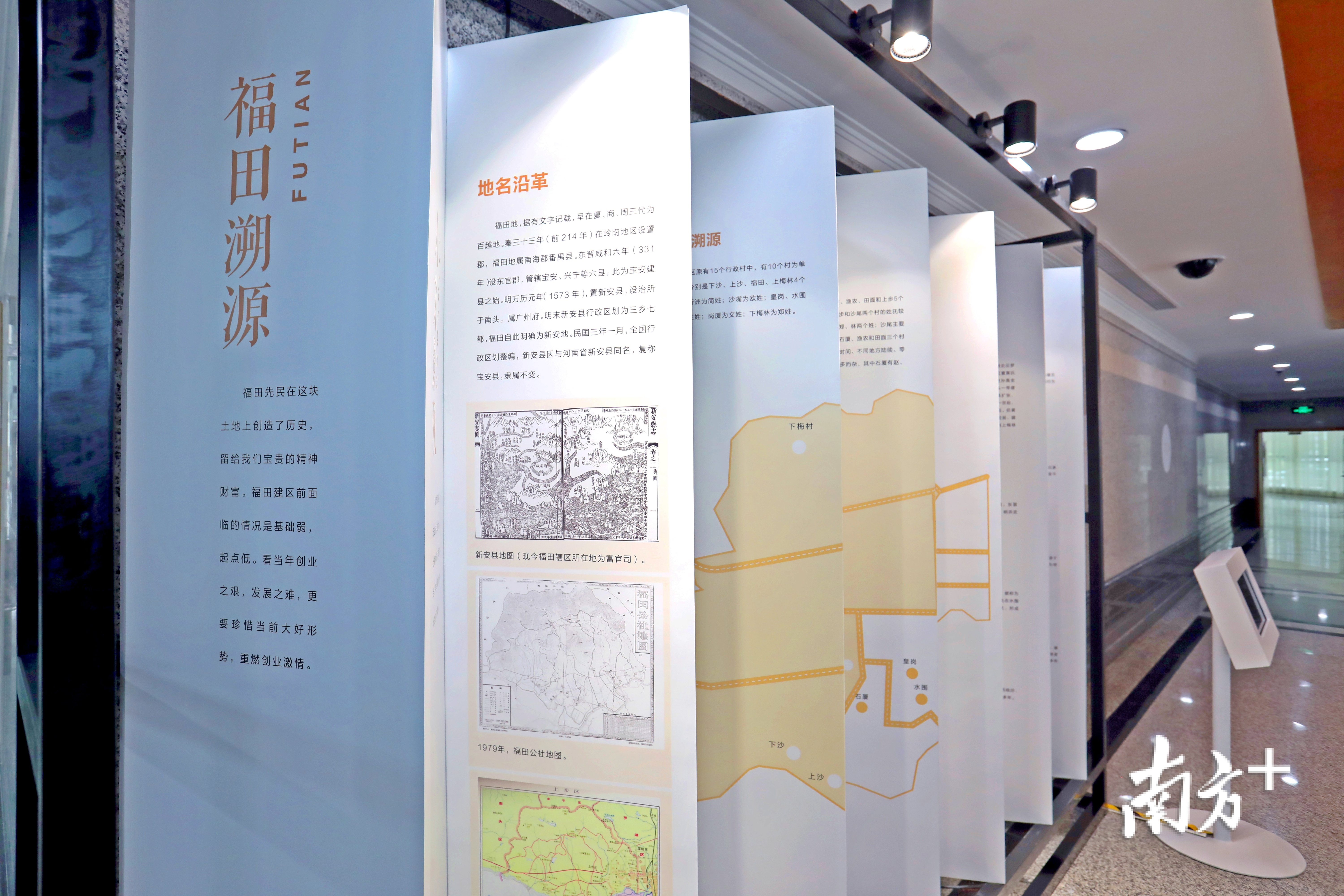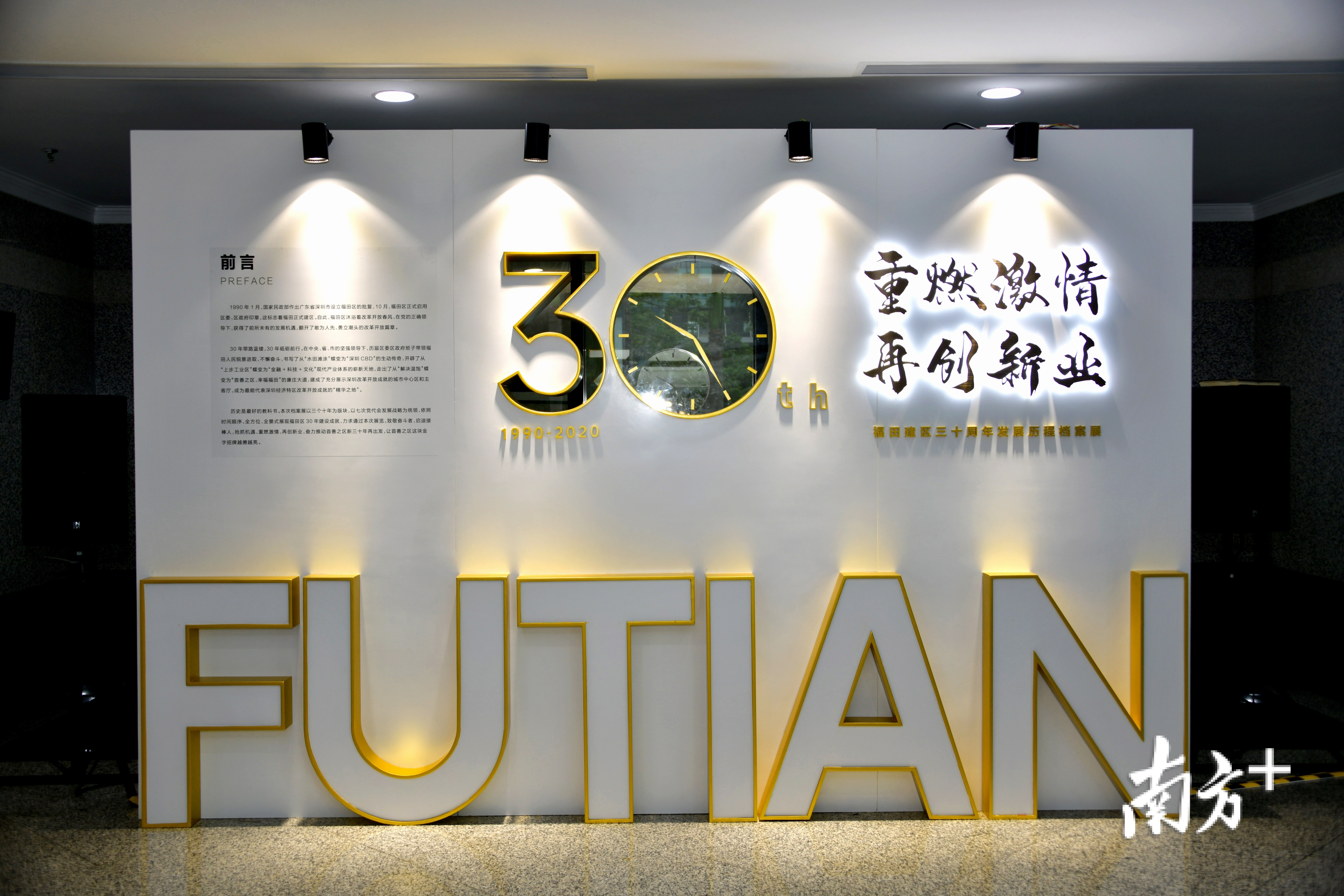 1990年1月,国家民政部正式批复设立福田区,10月,福田区正式启用区委、区政府印章。在展览的主题墙上,有一个“30”时钟指向“10点25分”,寓意着1990年10月25日福田正式建区。