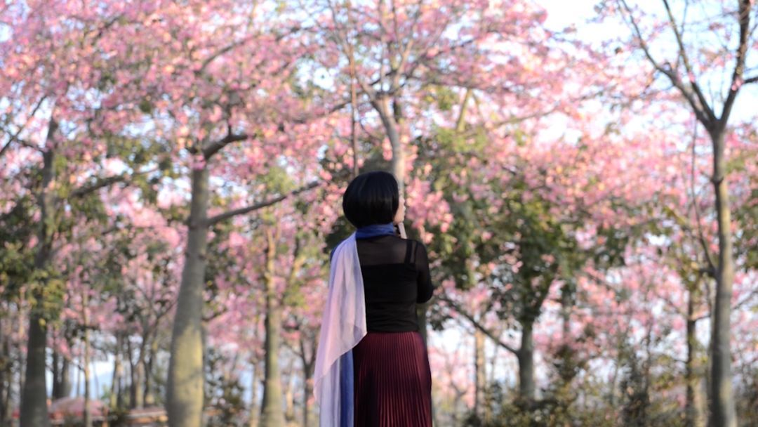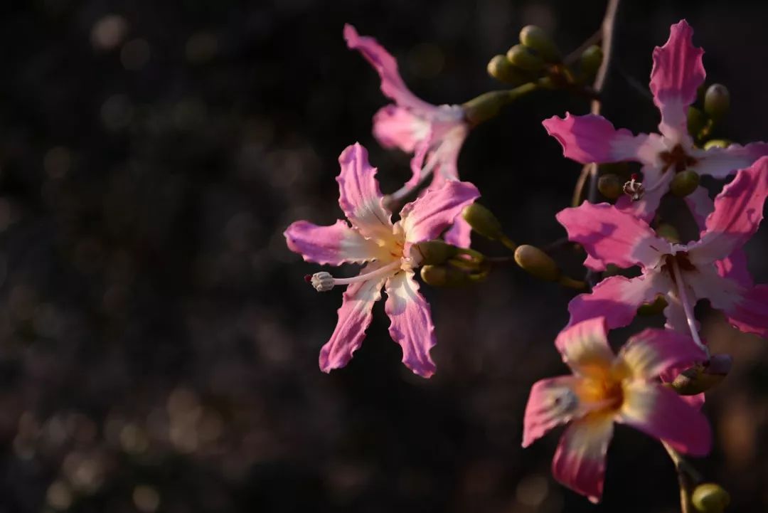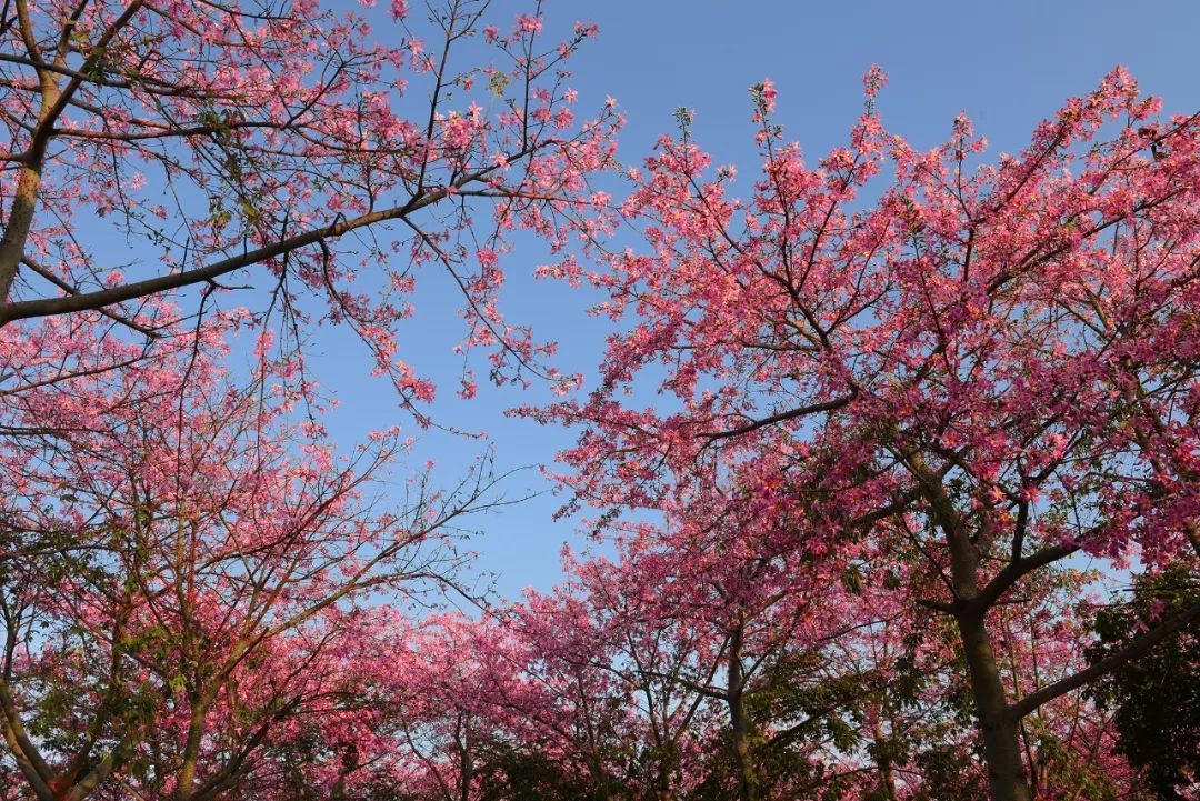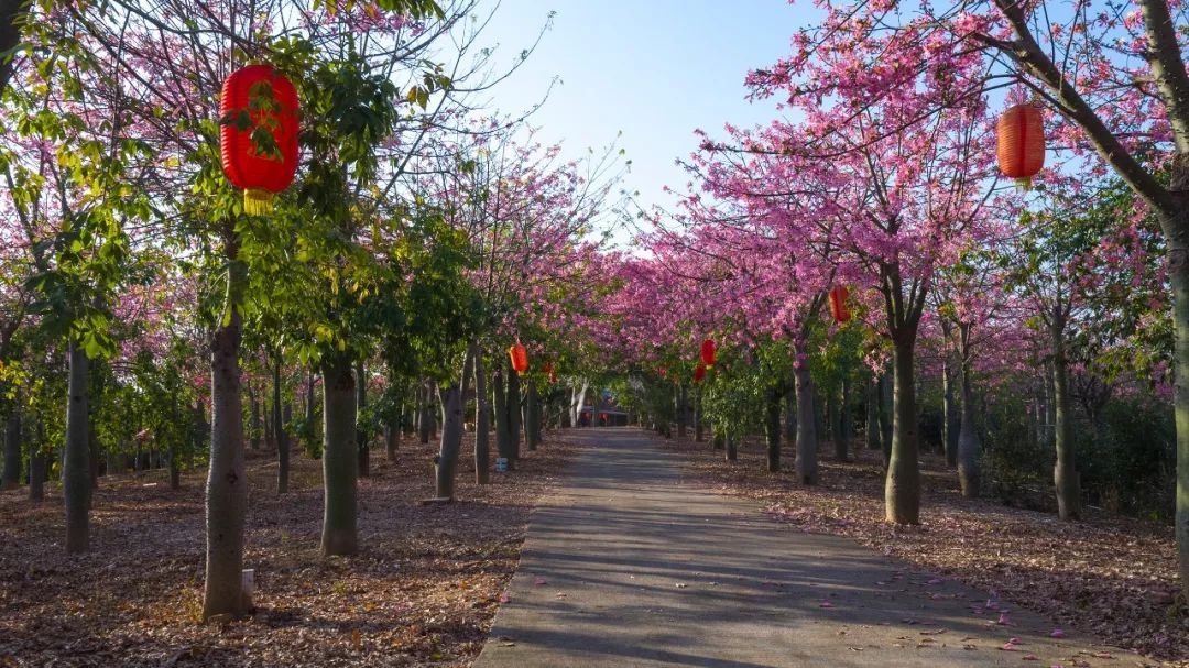 木棉生态园内,落英缤纷、璀璨斑斓,木棉花粉红粉红、娇艳欲滴。
