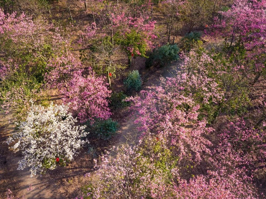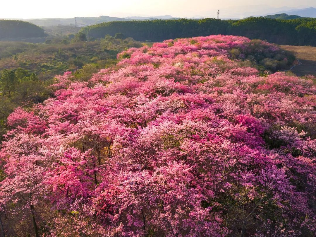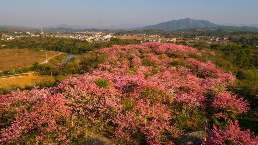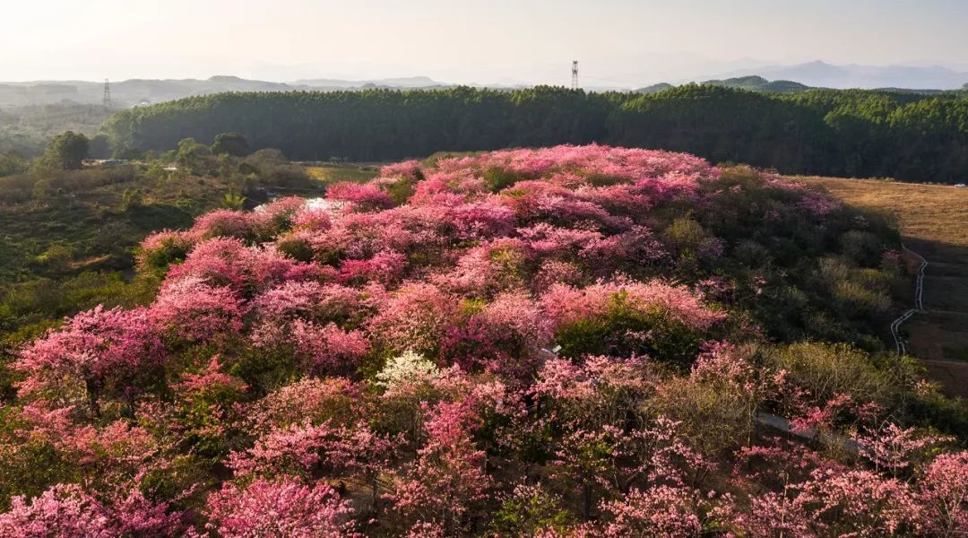 木棉花海像被打翻了的调色板,染上红、黄、白三种颜色,点缀在绿色田野环绕的山坡上,似一幅美丽乡村油画。