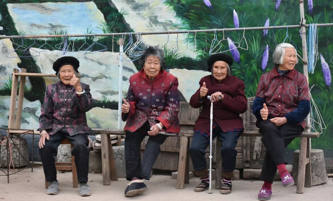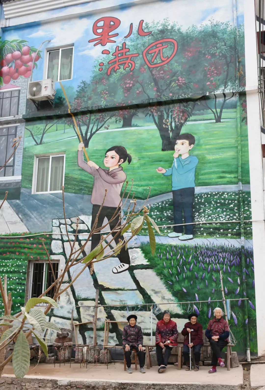 “果儿满园”墙绘下,村里的阿婆们坐成一排,闲聊家常,为新农村建设点赞。