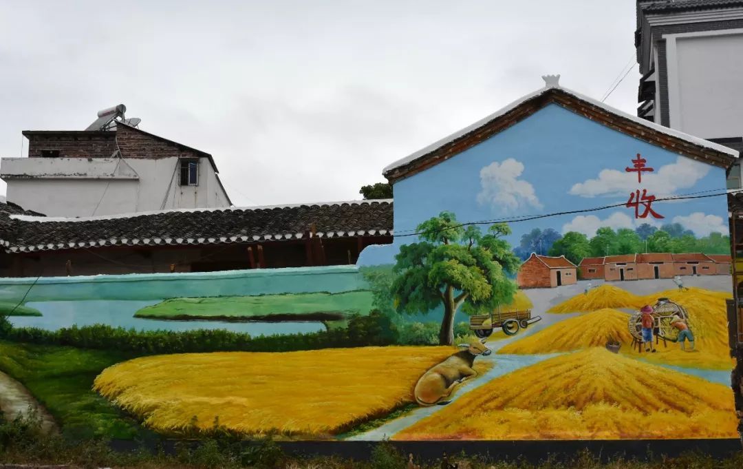 金黄的田野洋溢着丰收的喜悦,这幅丰收图在陈秀娥家的墙上展现着。