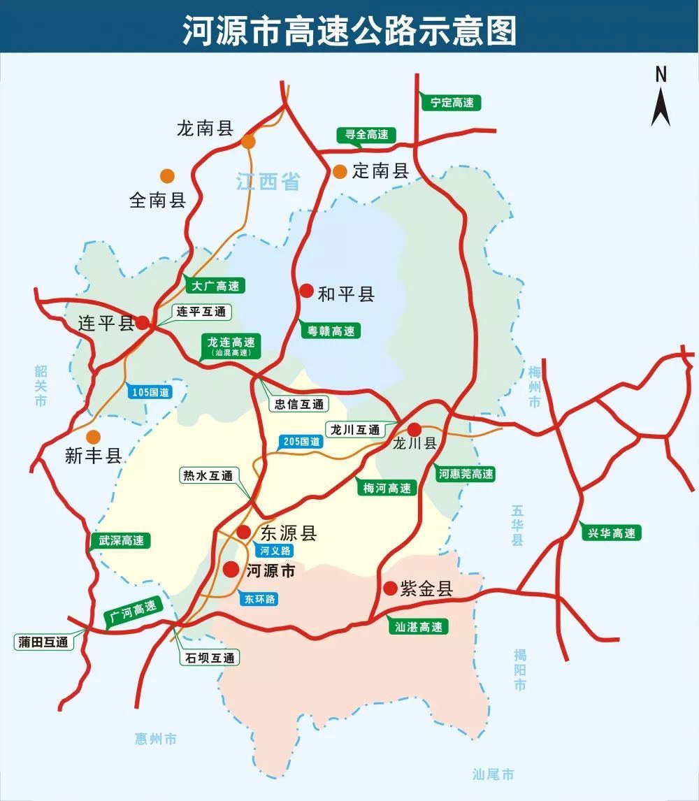 2020年1月1日,河惠莞高速紫金到龙川段正式通车,全程152公里,南面和汕湛高速在紫金交会,中间和长深高速在龙川交会,北面和江西省宁定高速连通,是我省又一条出省动脉,前往江西寻乌、梅州方向的朋友可以选择走河惠莞高速出行。