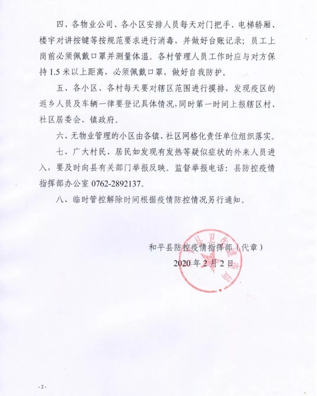 七、广大村民、居民如发现有发热等疑似症状的外来人员进入,要及时向县有关部门举报反映。监督举报电话:和平县防控疫情指挥部办公室0762-2892137。