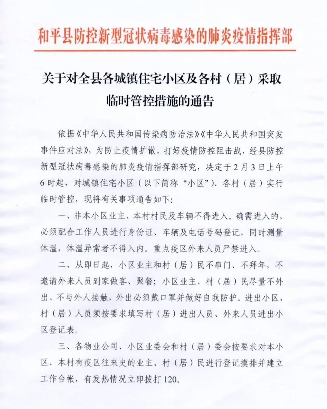 依据《中华人民共和国传染病防治法》《中华人民共和国突发事件应对法》,为防止疫情扩散,打好疫情防控阻击战,经县防控新型冠状病毒感染的肺炎疫情指挥部研究,决定于2月3日上午6时起,对城镇住宅小区(以下简称“小区”)、各村(居)实行临时管控,现将有关事项通告如下: