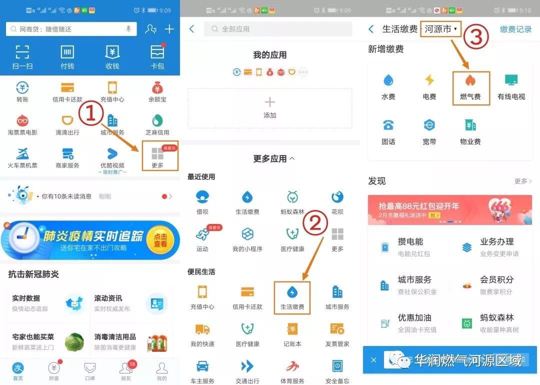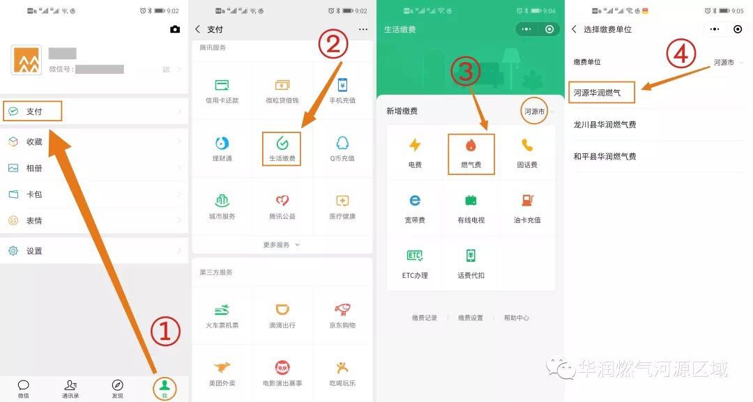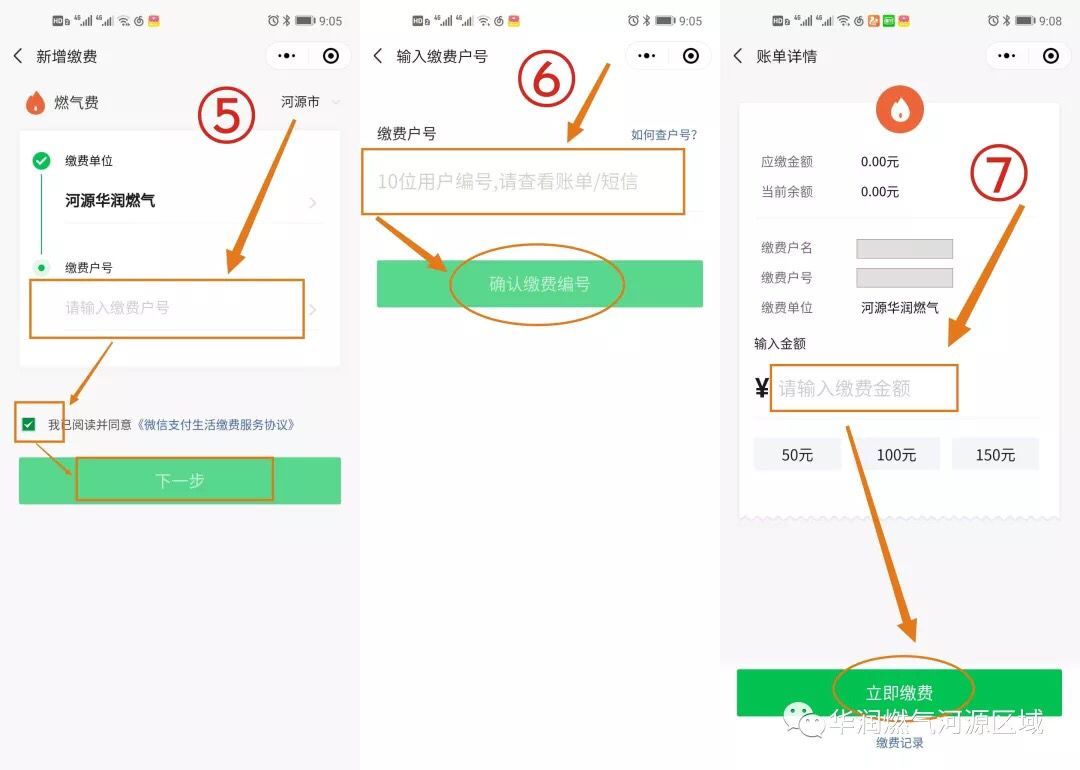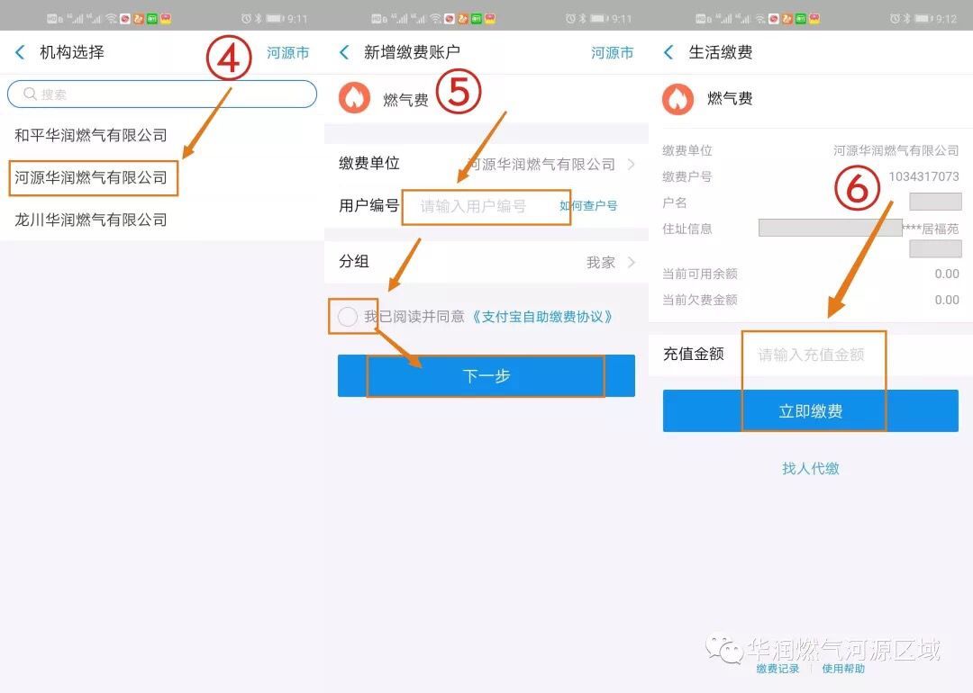 华润燃气有限公司客户可通过微信平台或支付宝平台的生活缴费界面,进入缴费程序,选择“河源华润燃气”,输入十位数用户编号,点击下一步进行充值或缴费。