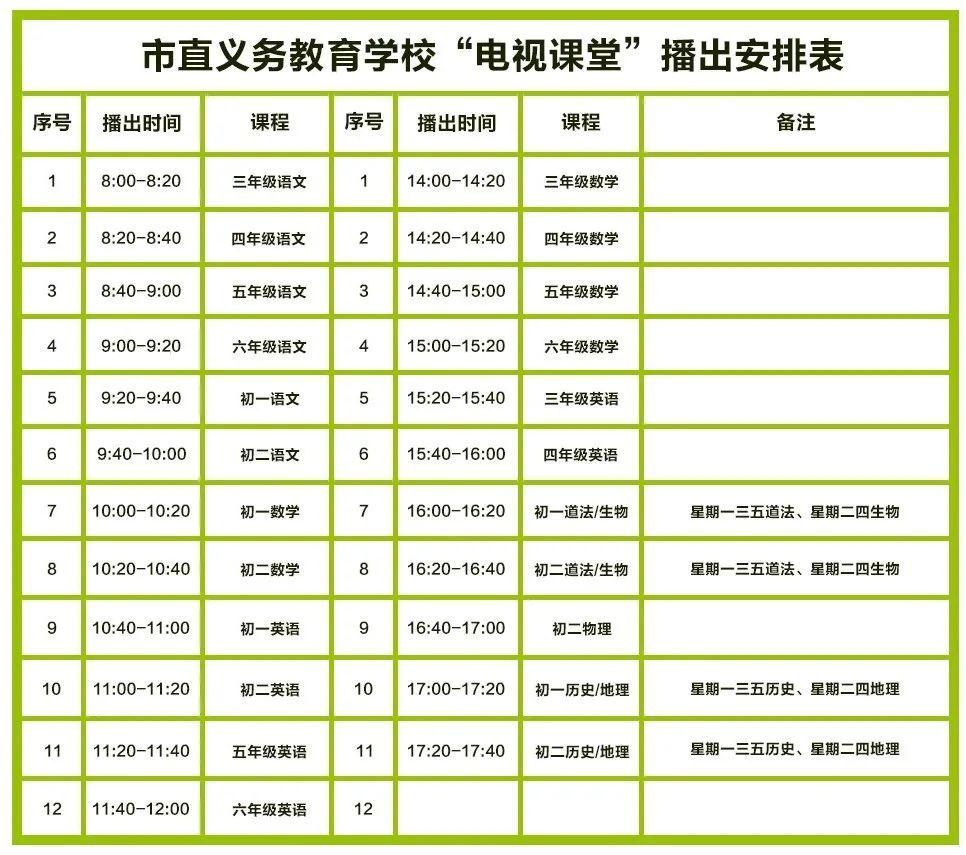 “电视课堂”从3月3日起每周一至周五,上午8:00—12:00、下午14:00—17:40,每天共播出23节课(20分钟/节)。授课范围为义务教育阶段小学三至六年级的语文、数学、英语共三个科目,初一、初二年级语文、数学、英语、物理、道法、生物、地理、历史共八个科目。