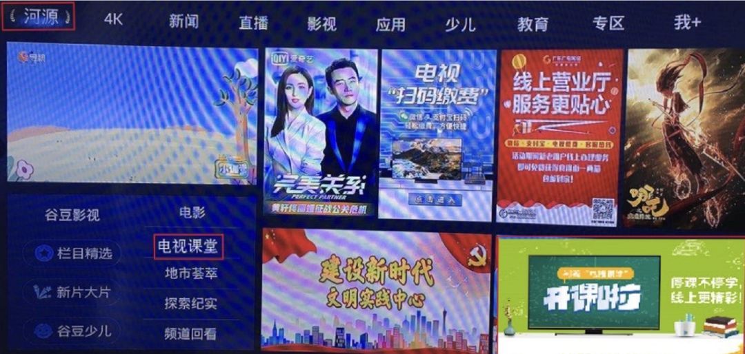 进入河源专区(打开电视默认进入的专区),选择左下角“电视课堂”按钮或右下角图片“开课啦”进入“电视课堂”专区。