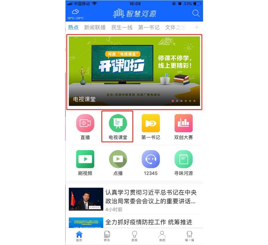 打开“智慧河源”APP,点击首页顶部幻灯片或“电视课堂”,进入后选择各年级课程,即可点播观看。