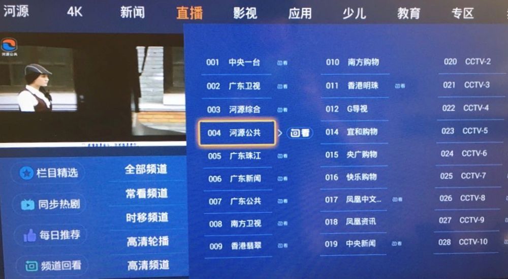 进入电视的直播频道,在频道选择列表中选择“河源公共”频道。直播结束后可以进行时移回看。