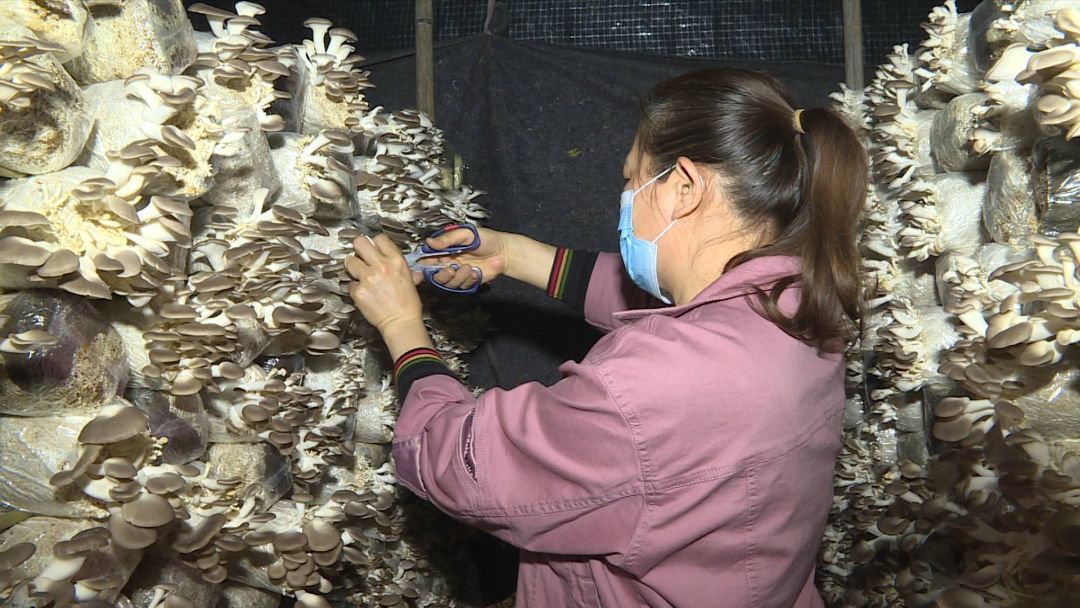 在凹头村秀珍菇种植基地的加工车间,工人们正忙着用杂木屑、麦麸及棉籽对菌包进行加工。经过装包、消毒、育种等流程,才能放入生产大棚进行育菇。农户们正争分夺秒地采摘、分拣,窜出菌包的秀珍菇个头不小,菌盖厚实,成为该村脱贫攻坚路上的又一“新法宝”。