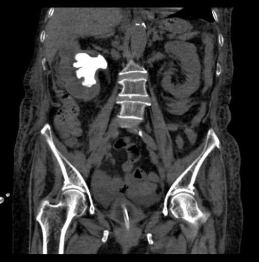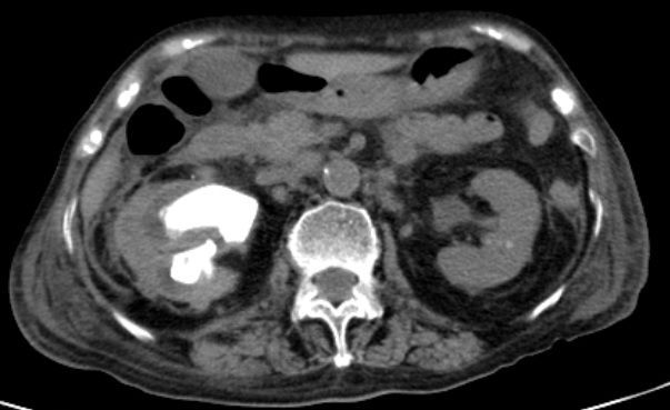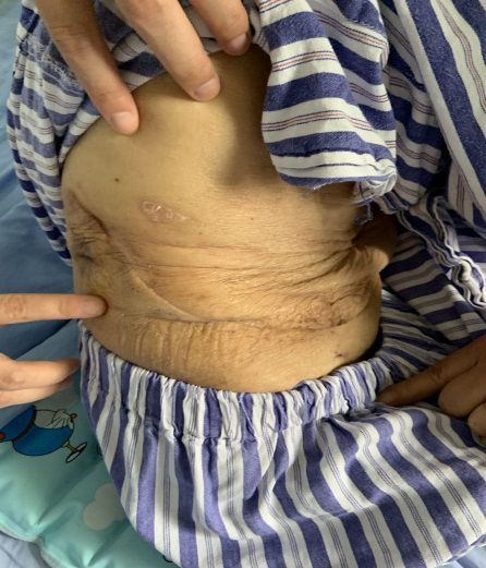 阿婆今年75岁,3年前因右侧腰部巨大包块查出右侧肾积脓,在外院急诊行右侧肾穿刺造瘘术,术后引出大量脓液,病情好转后出院回家疗养。