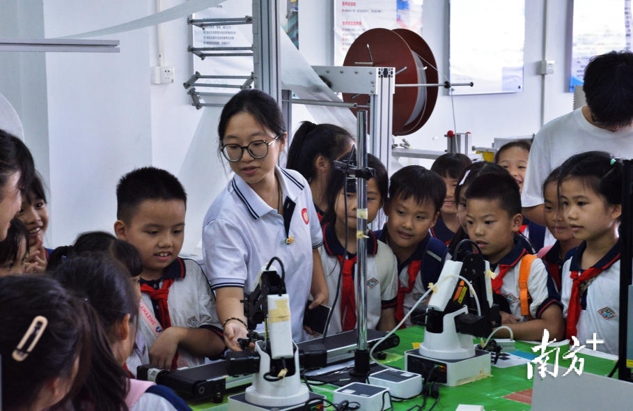 大学生志愿者为小学生讲解机械手臂运作原理。