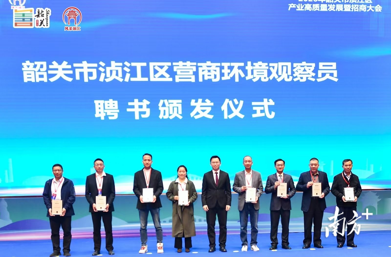 为进一步凝聚发展合力、拓宽招商渠道、优化营商环境,充分发挥各界力量在浈江区高质量发展中的重要作用,大会现场举行浈江区首批招商大使、营商环境观察员聘书颁发仪式。鲁锦锋为林保平、林卓然、张宏强等10名来自各行各业的企业家、商协会负责人和行业精英颁发招商大使聘书,这批招商大使将成为浈江的“代言人”和“合伙人”,发挥行业影响力以商引商,推动更多优质企业和项目落地浈江;周昭坚为徐春华、甘建平、陈锋等8名来自人大代表、政协委员、企业代表、政府部门等不同领域的代表颁发营商环境观察员聘书,观察员将当好浈江营商环境的“监督员”和政企沟通的“连心桥”,以监督视角倒逼服务提升,真正让企业在浈江乐于投资、常于投资。