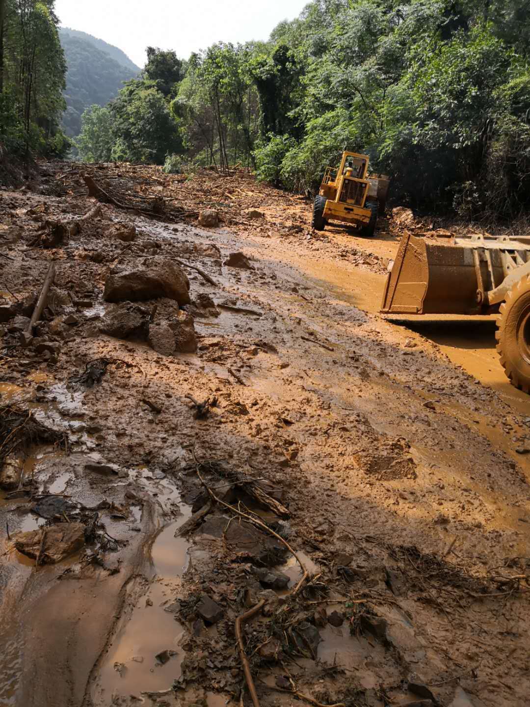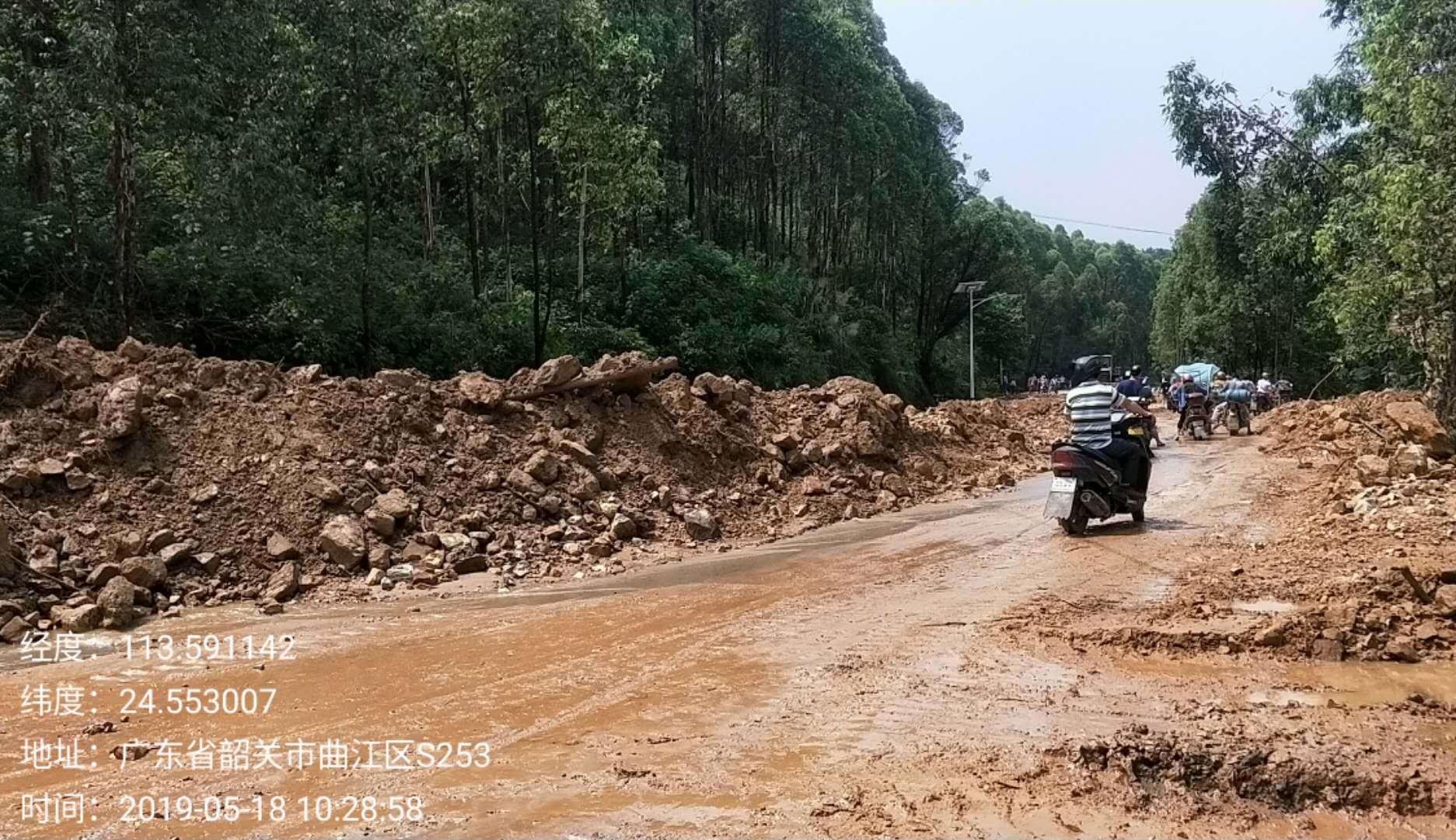 韶关市国道G240线(原S253线K34+050-K34+200)曲江乌石镇亚婆庙段因强暴雨导致泥石流塌方,于18日7:00时交通中断,现抢修人员及机械已至现场清理疏通中, 已于当日上午11时抢通半边通车,目前抢修清理工作仍在继续。