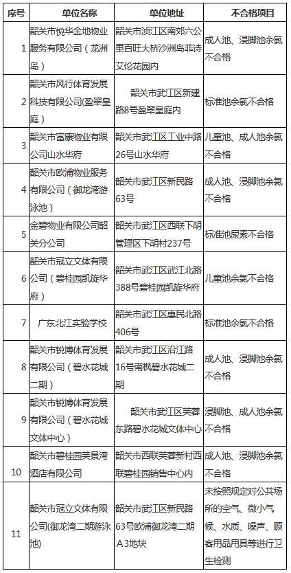 根据2019年6-7月的一份随机抽查结果,韶关市区31家游泳场所中有11家不合格!