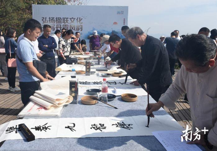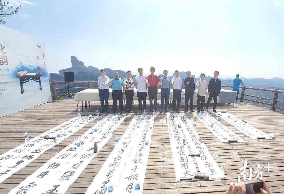 活动当天,韶关市吴土清、林建、杨常衡、罗汉城、廉清华、陈景锋等多位书法家齐聚一堂,在丹霞群峰环绕的韶音亭平台上,挥毫书写丹霞山楹联获奖作品。这些楹联作品均为丹霞山楹联征集活动中评选出来的优秀获奖楹联,立意高远、内涵深刻、构思巧妙、意境优美,充分彰显出韶关和丹霞山的旅游特色、人文历史、品牌形象等。